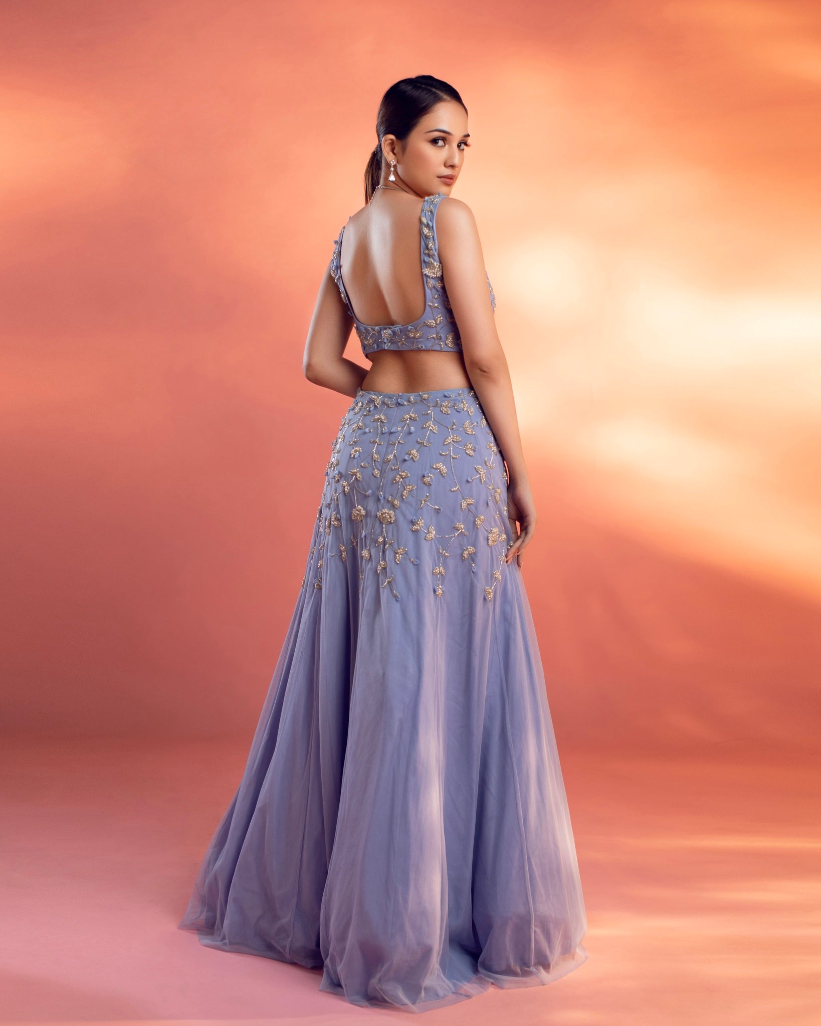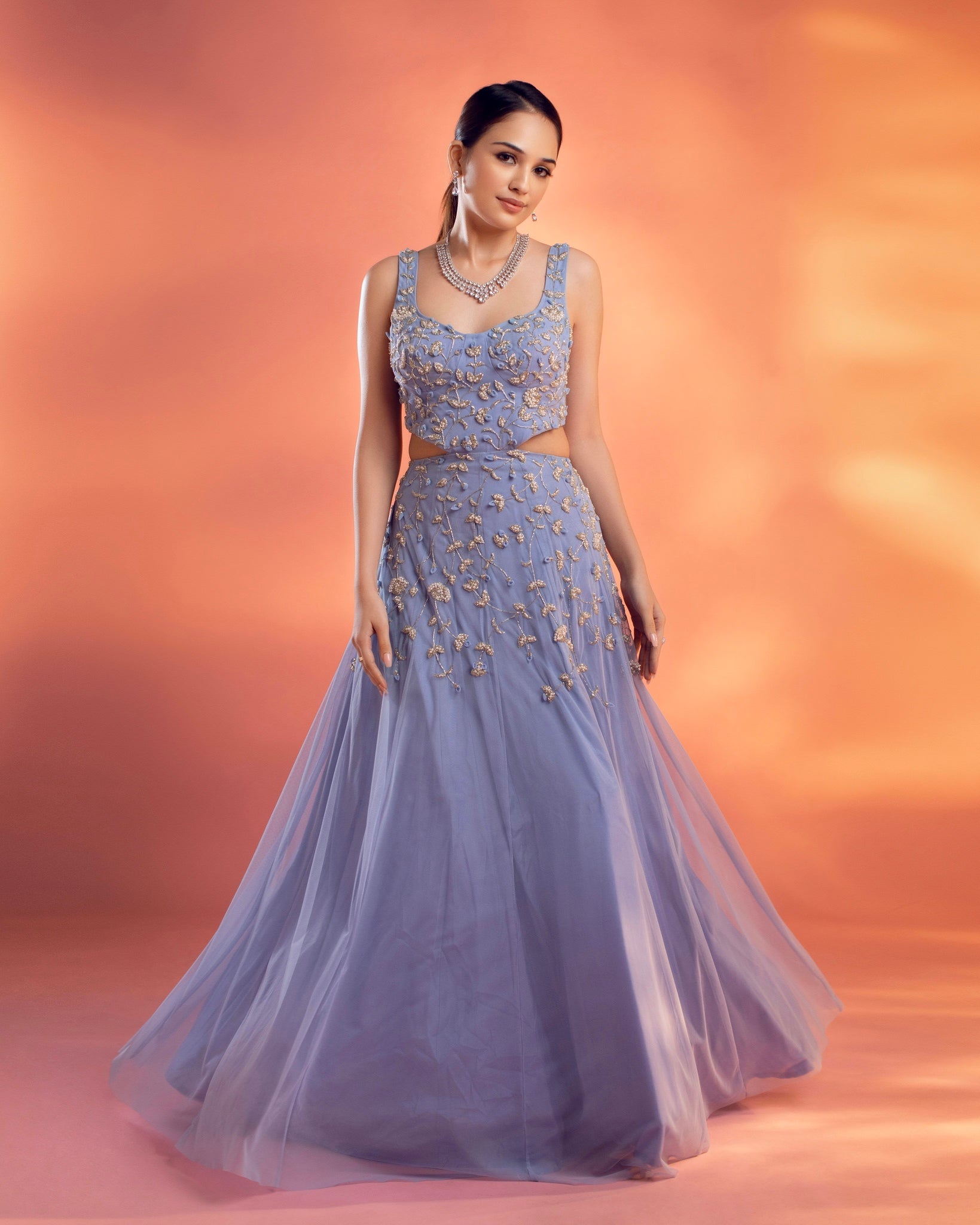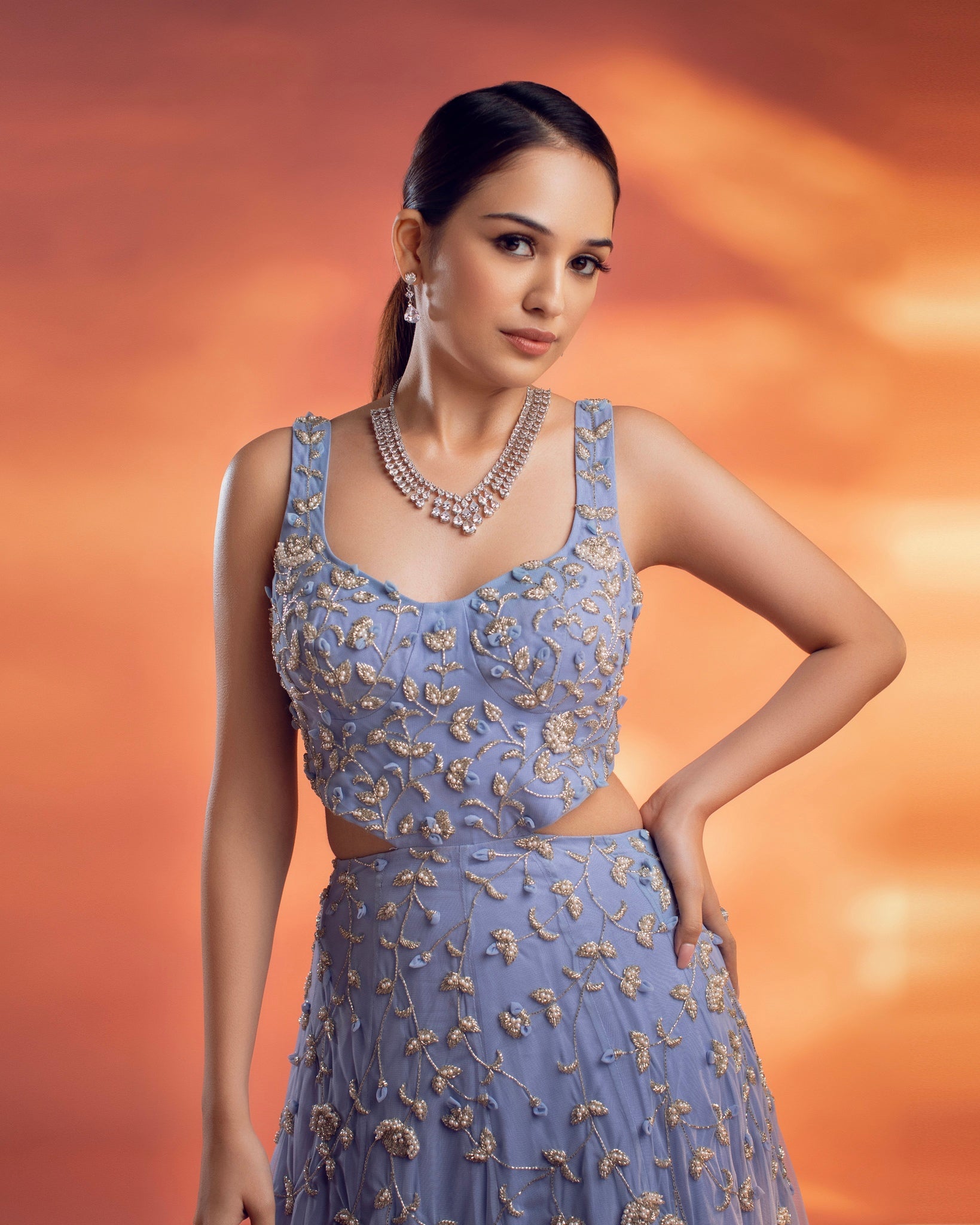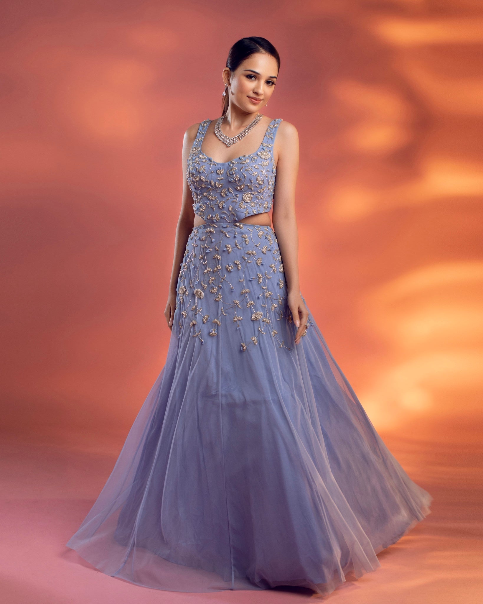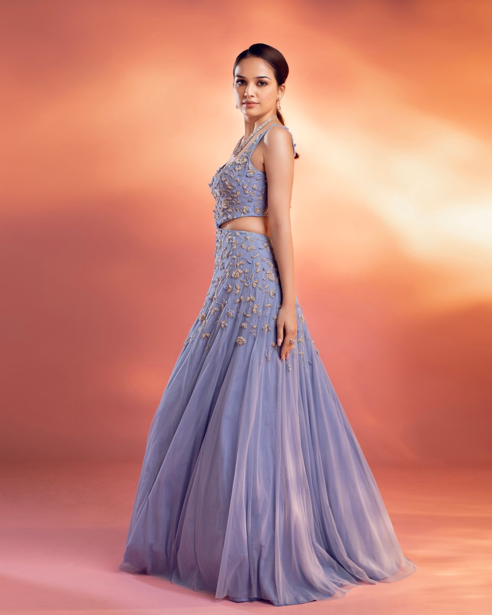 Blue gown along with a waist cut, embellished with glass beads and pearls over a net base.