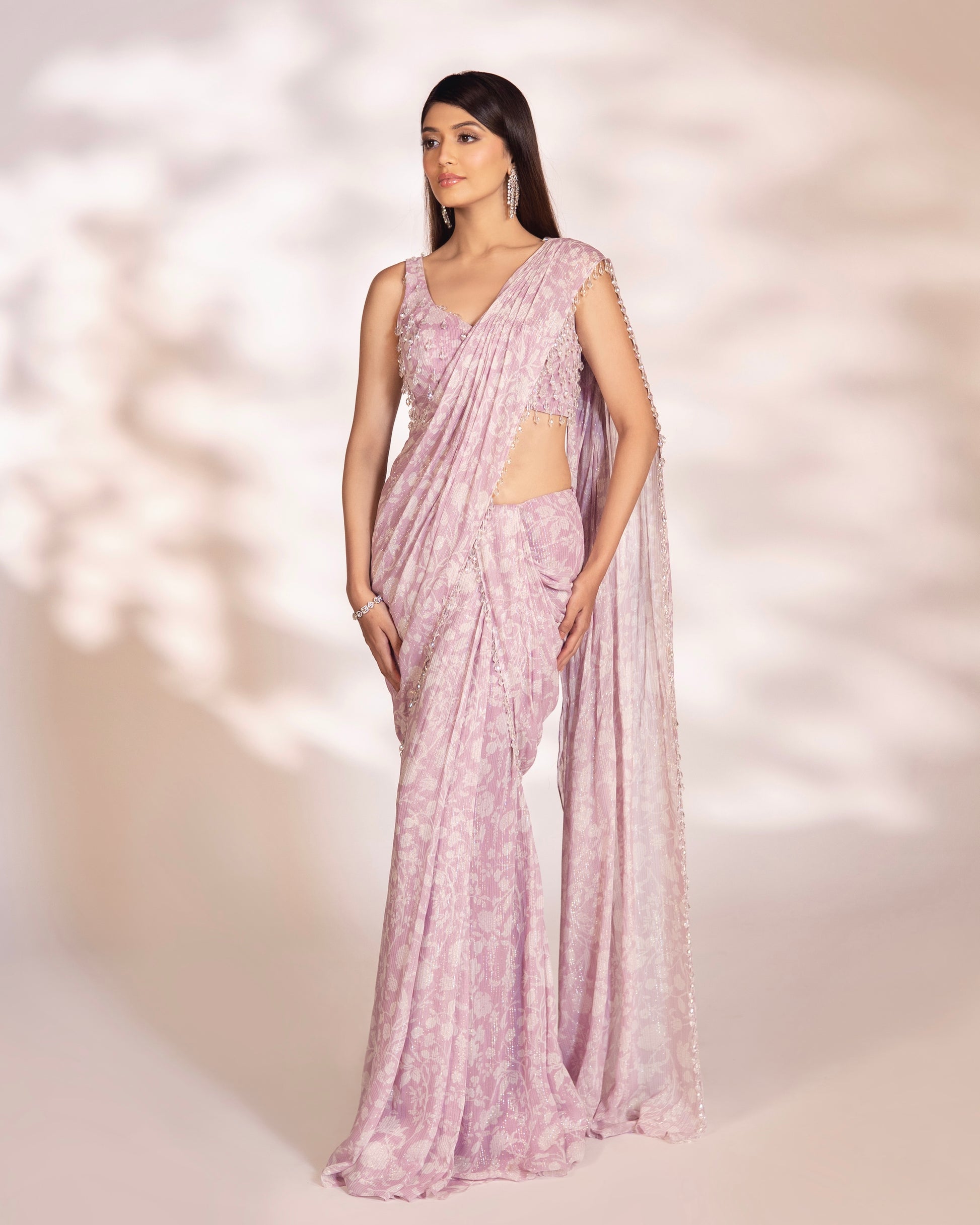 Purple pre-draped saree with glass drop hangings embellished on the blouse and pallu.