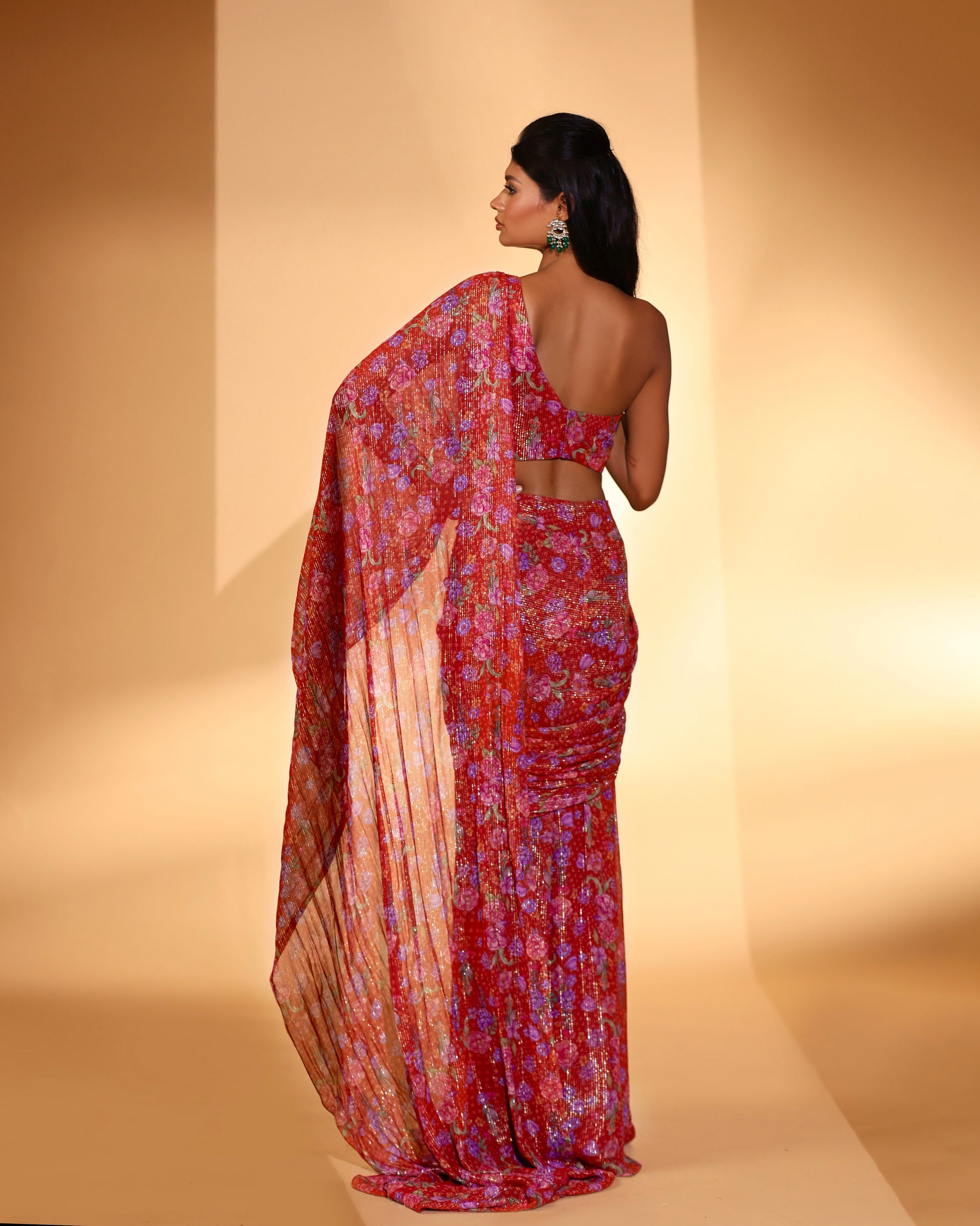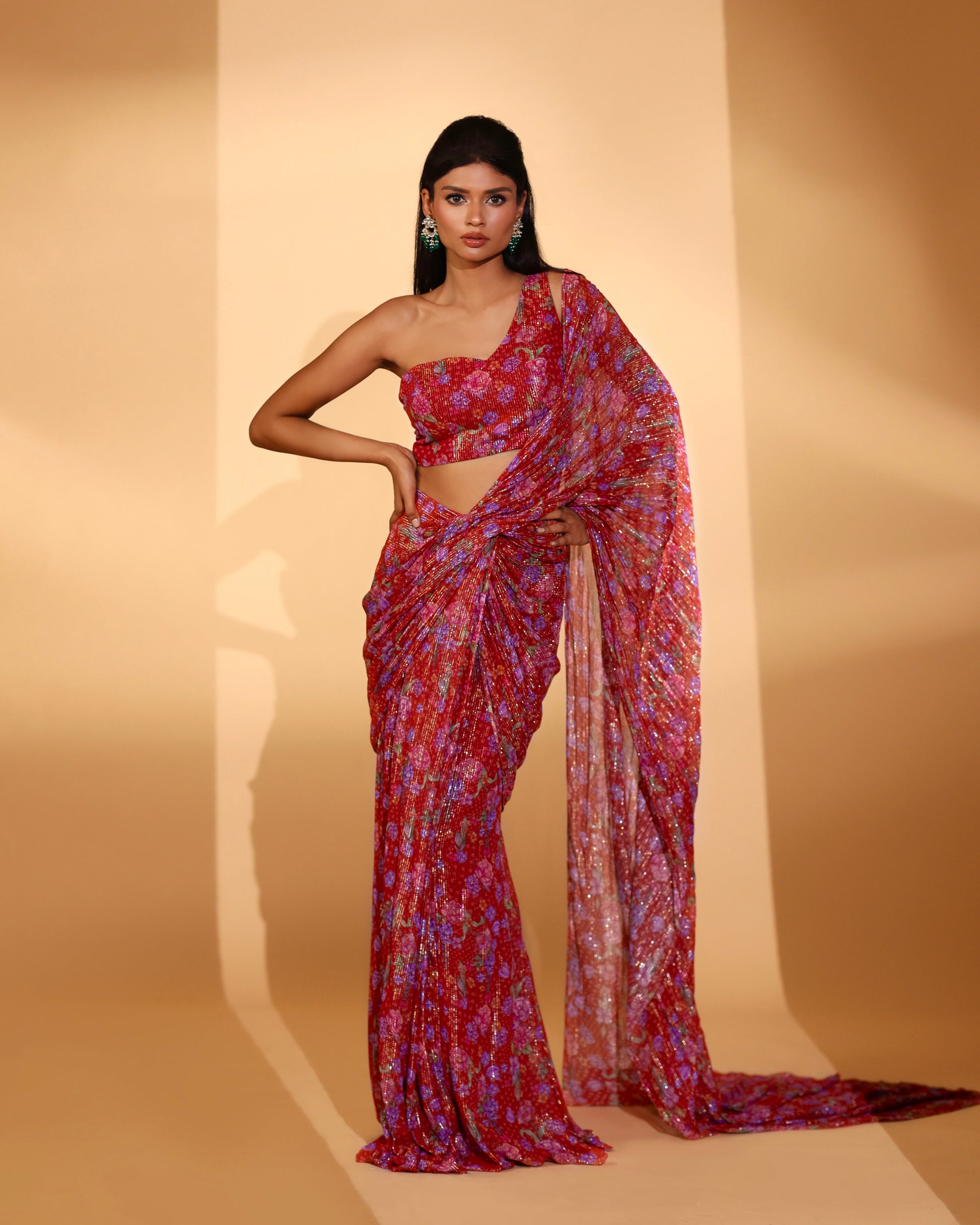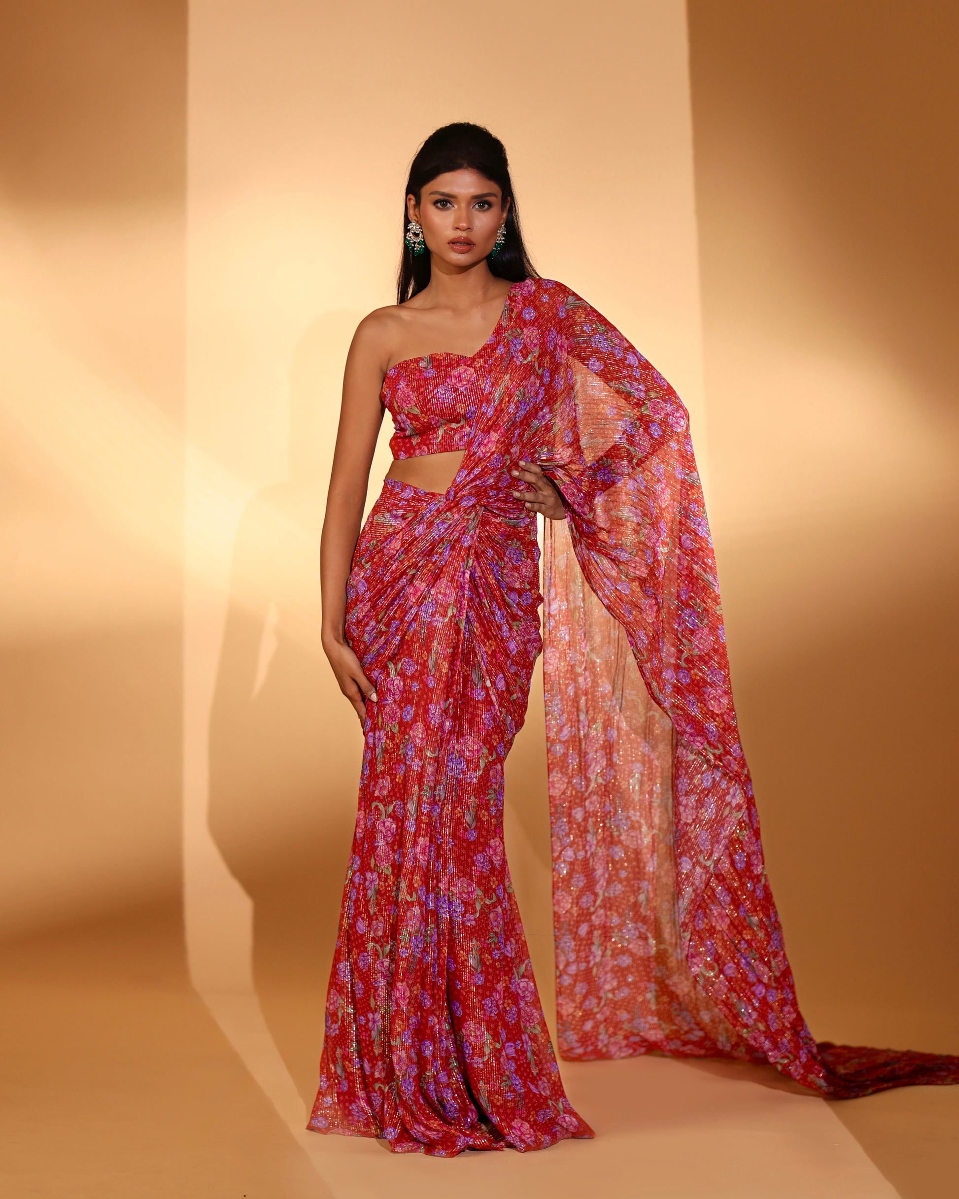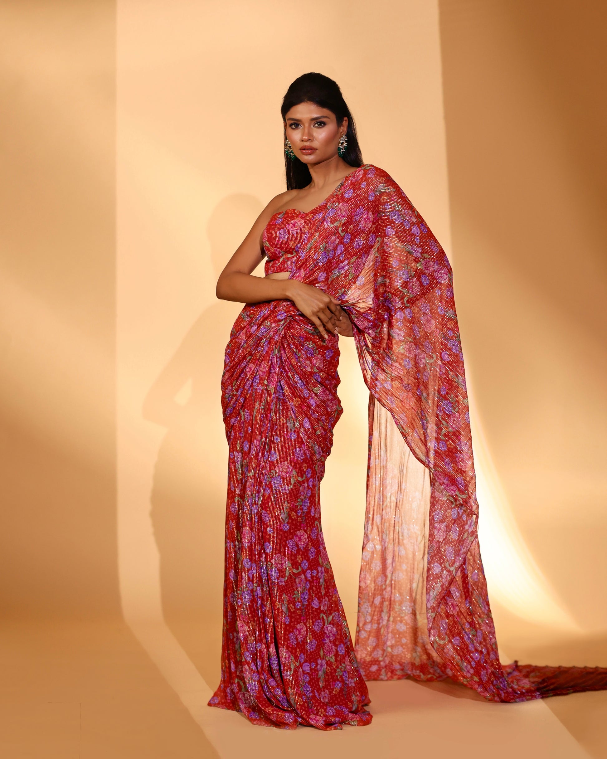 Red printed pre-draped saree set.