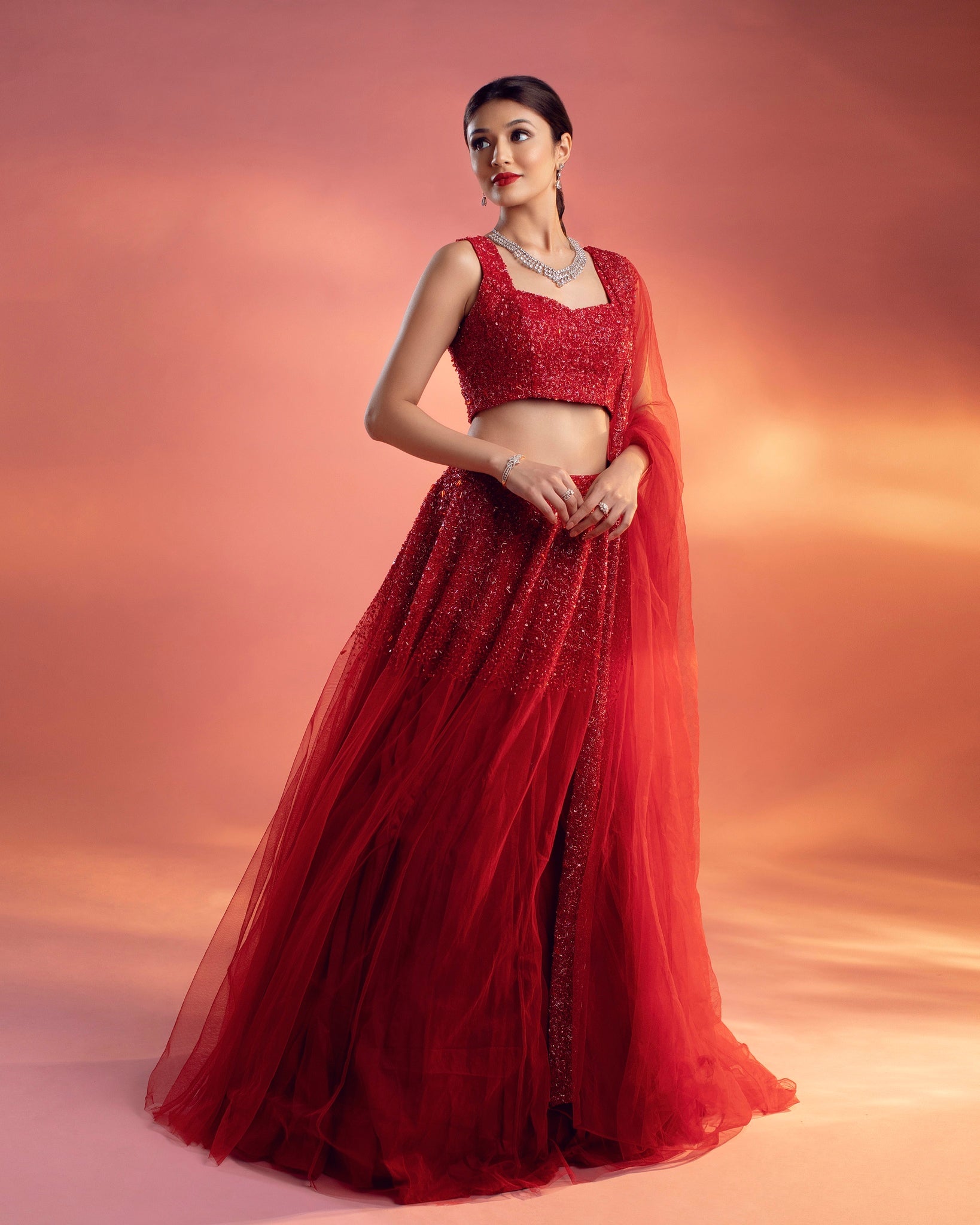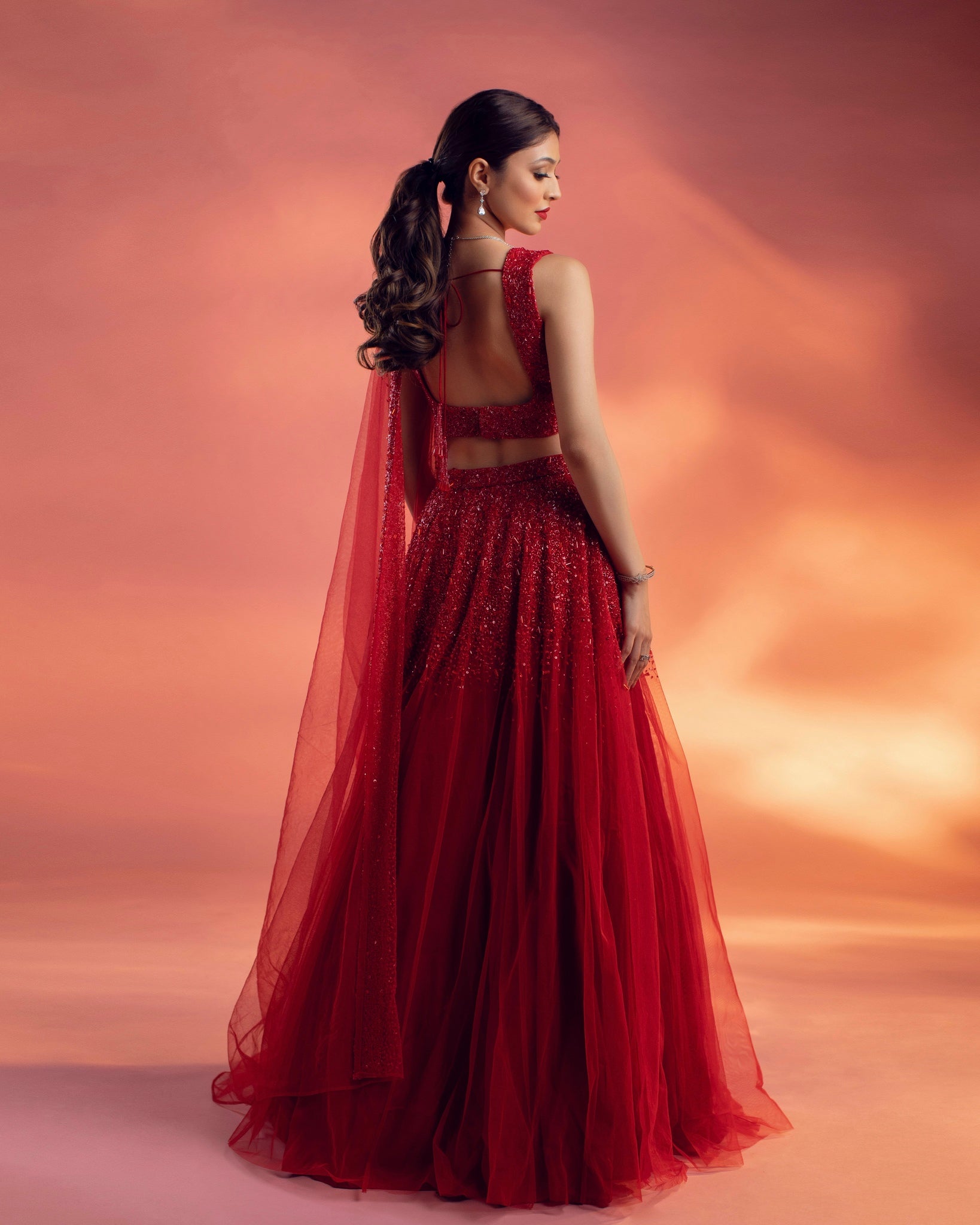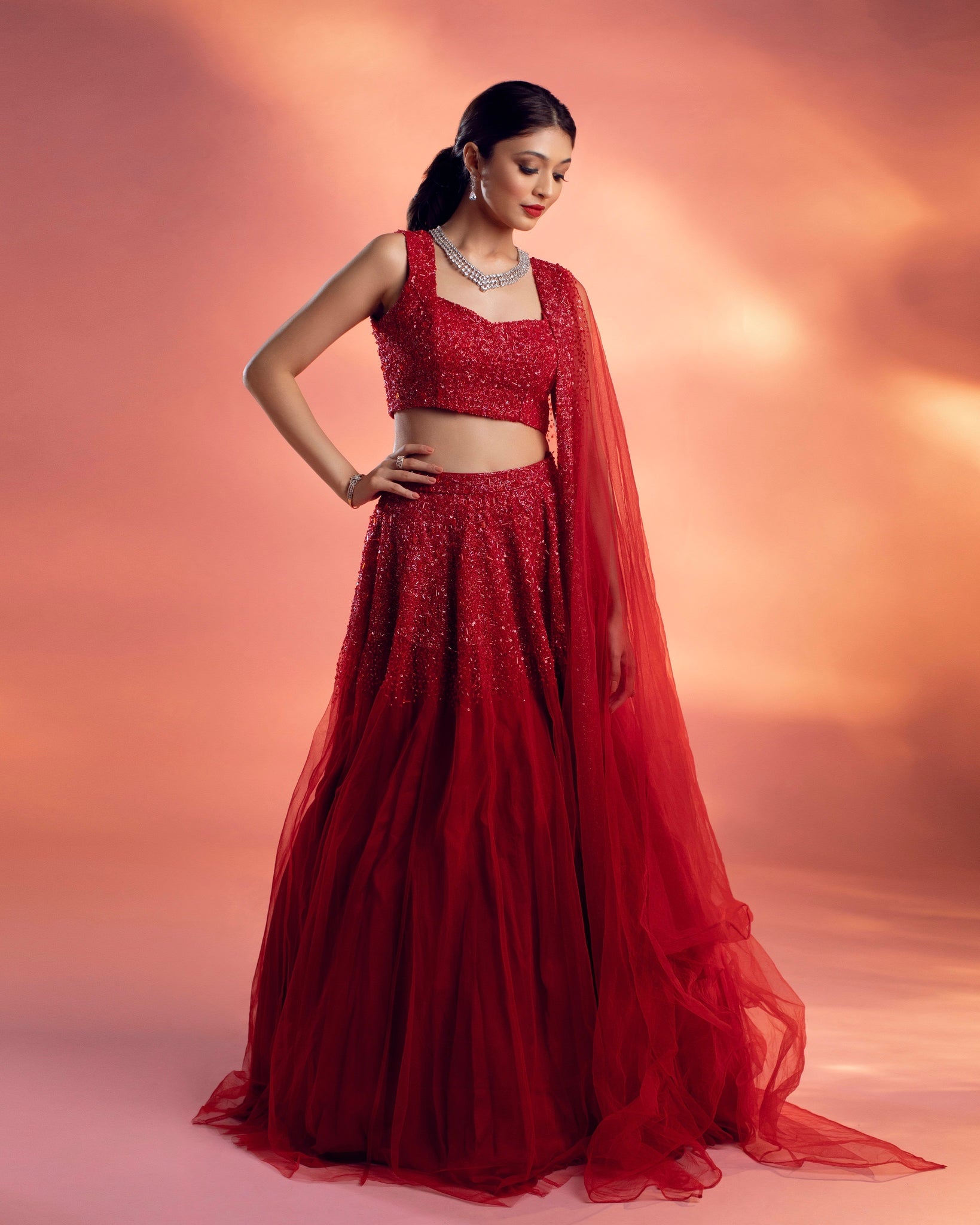 A red lehenga set embellished with an ombré embroidery with glass beads, flat crystal beads, and sequins