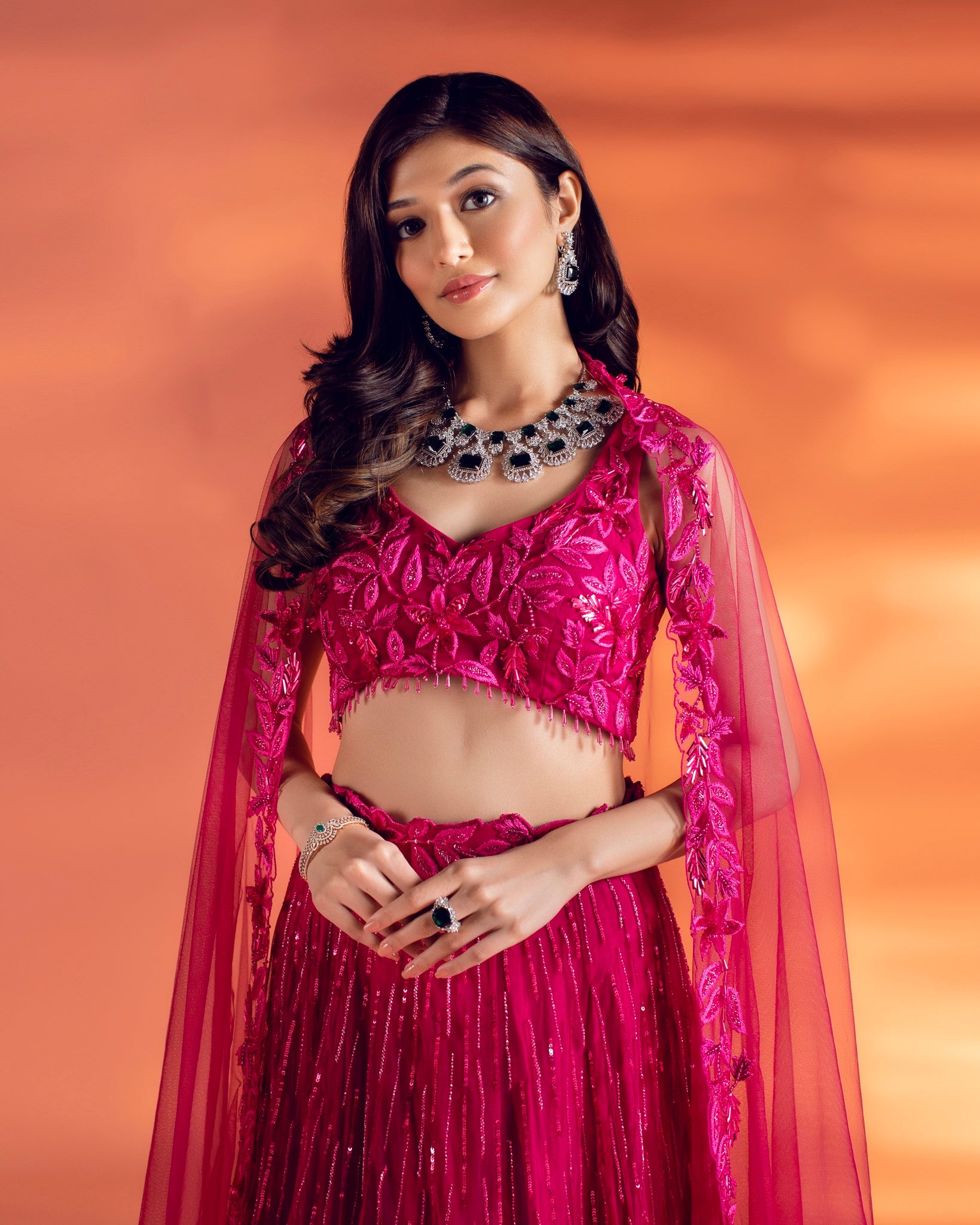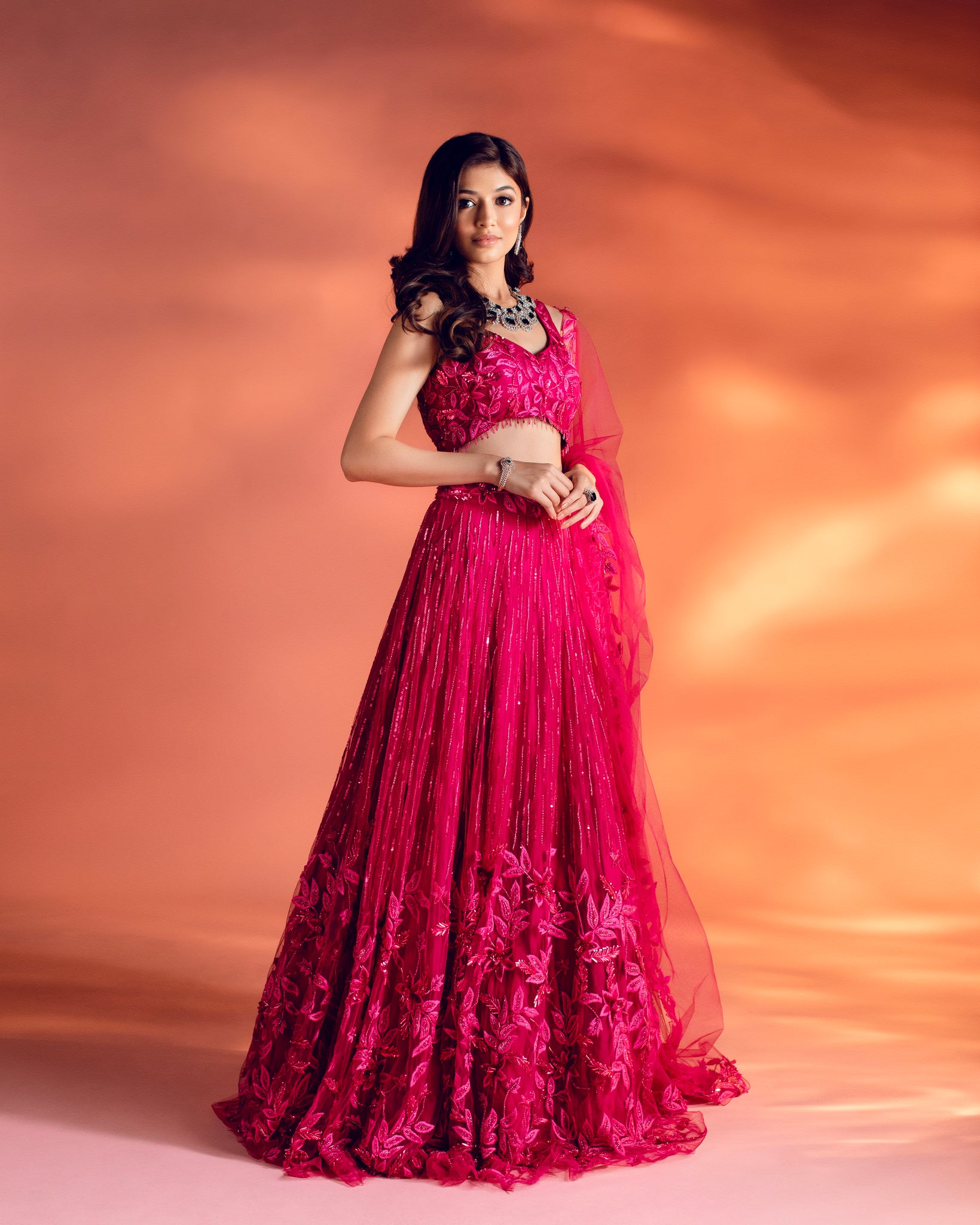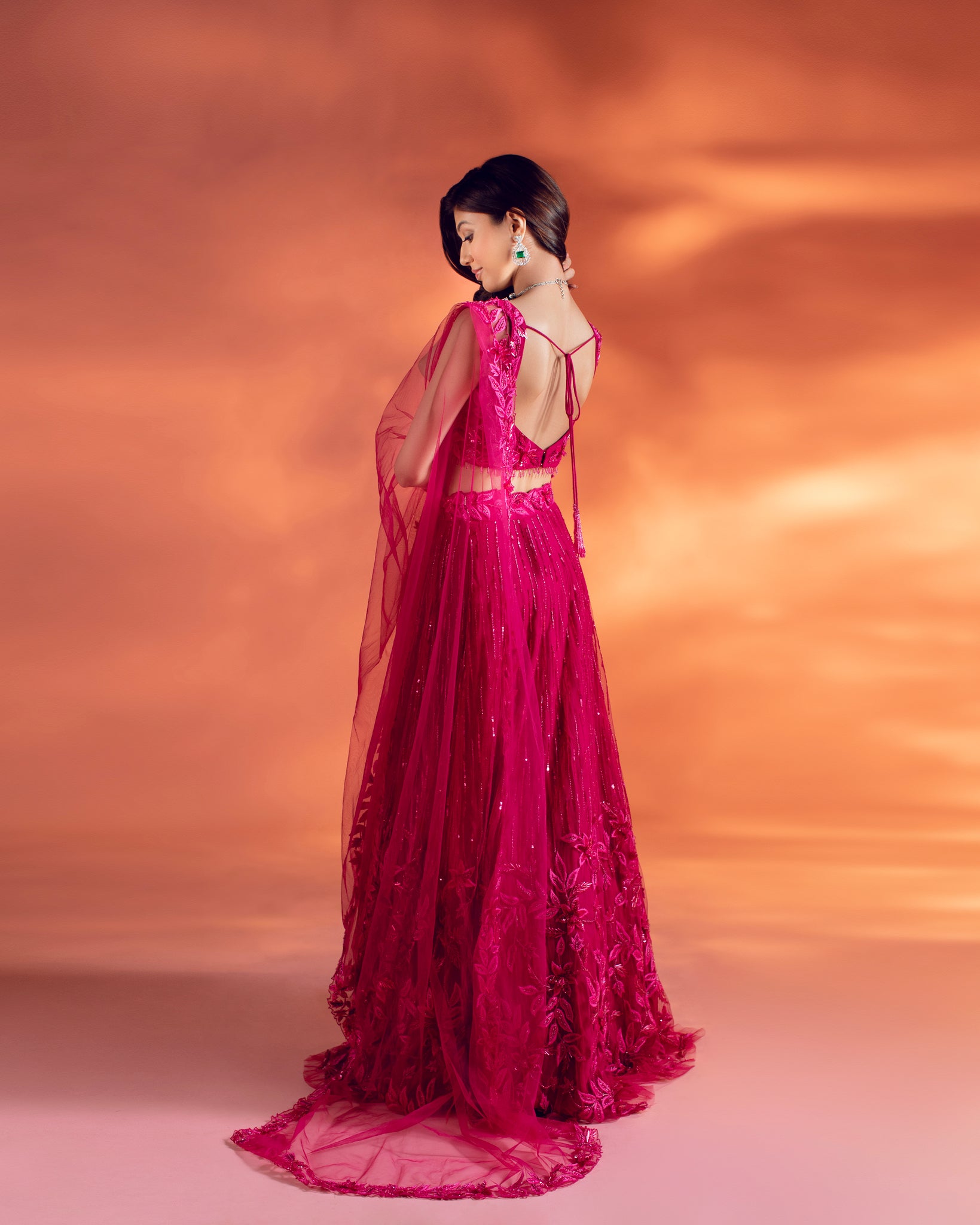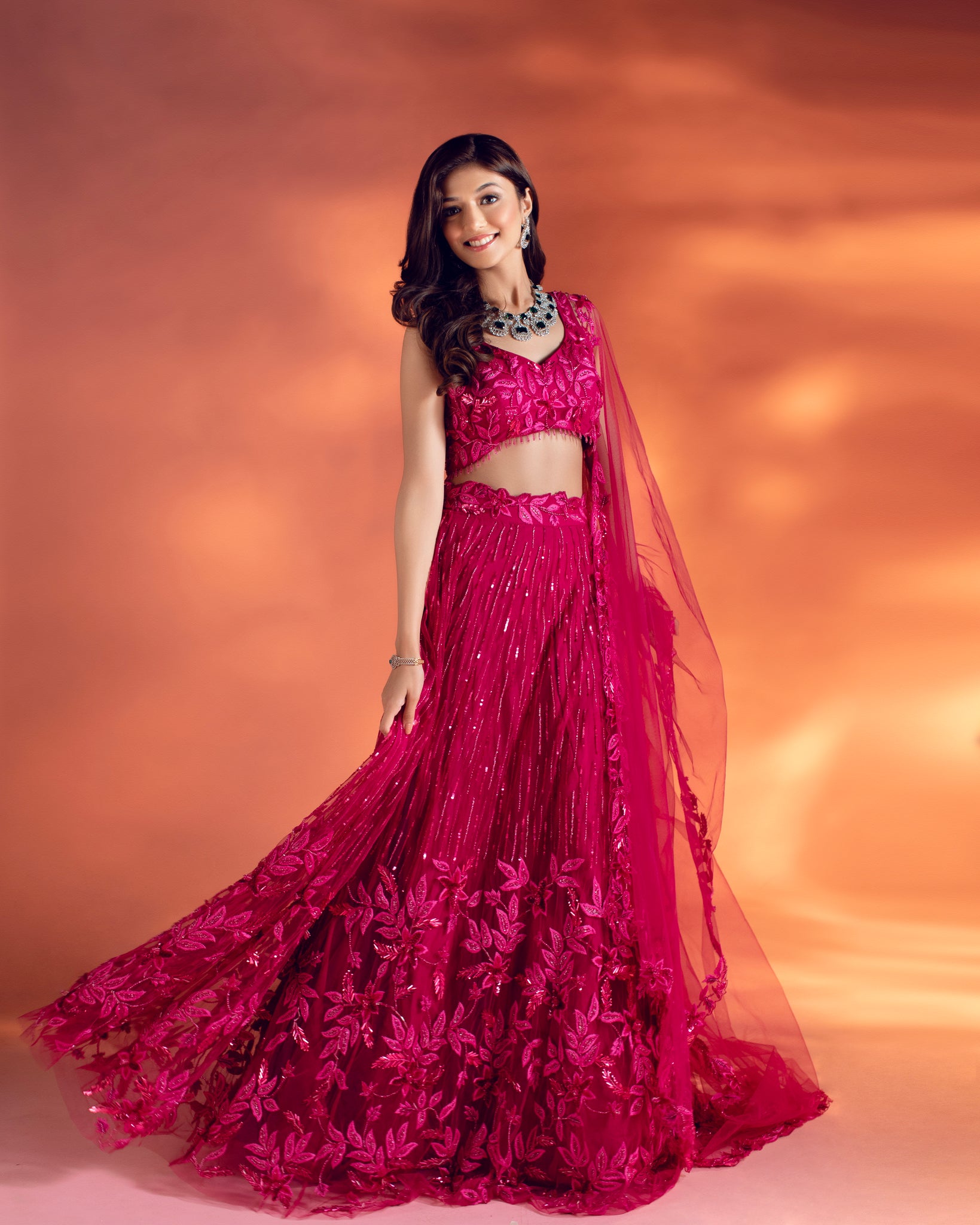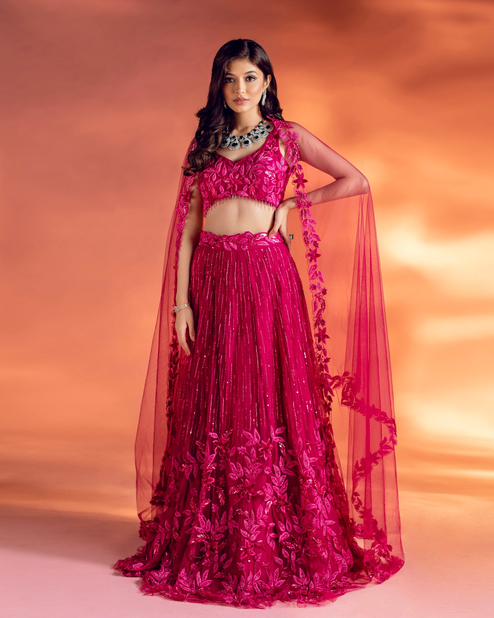 A net base lehenga set in magenta, with floral embroidery sewn with glass beads, resham threads, and sequins.