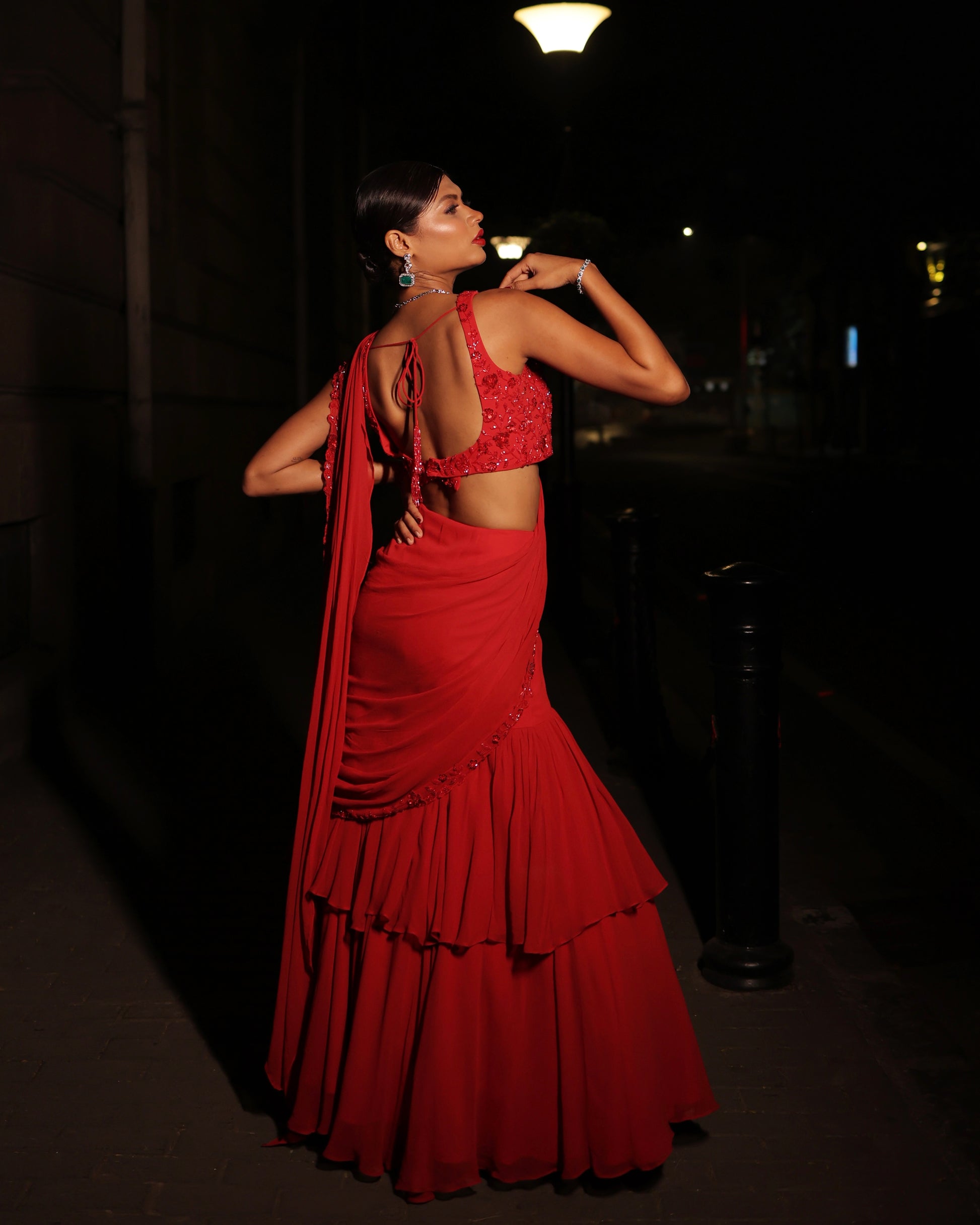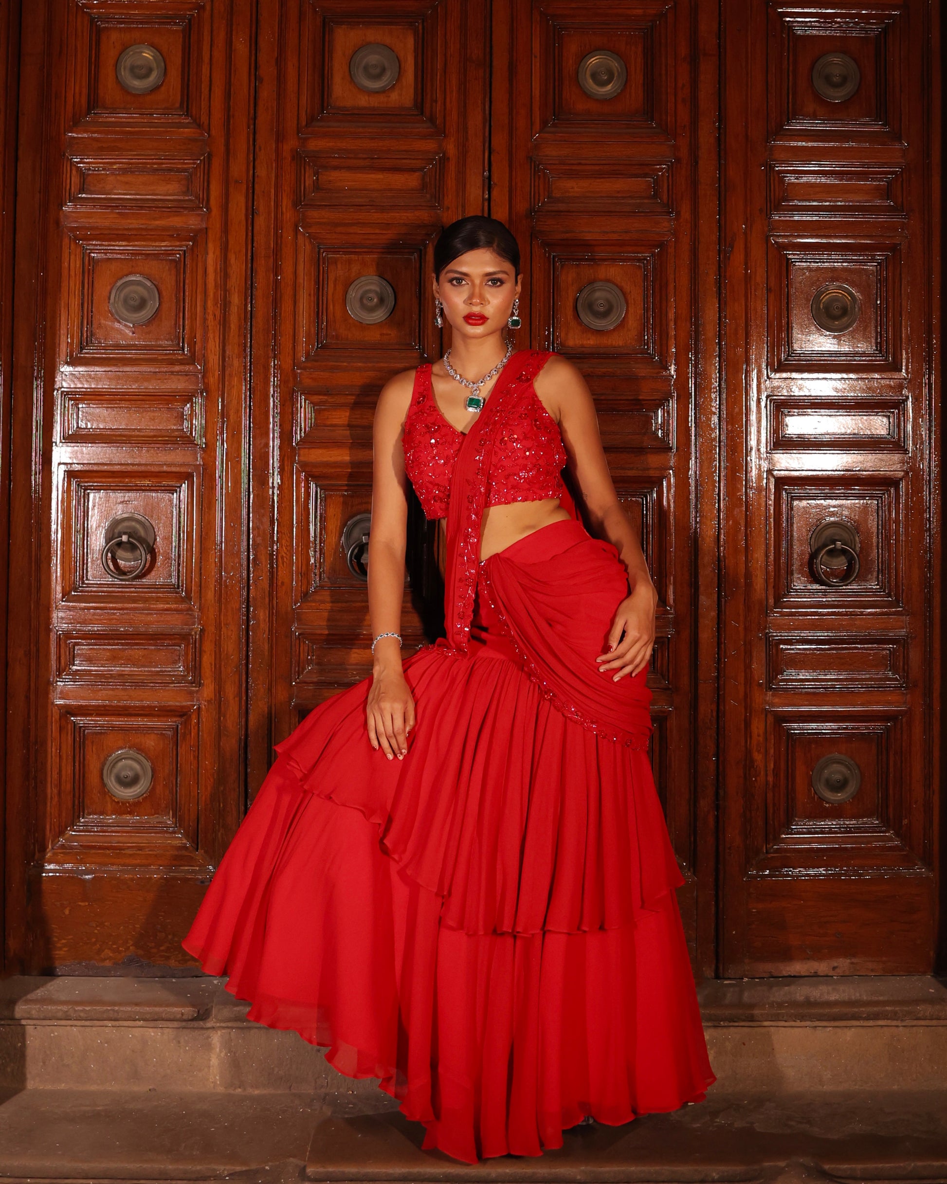 Red pre-draped saree with embellished blouse and drape.