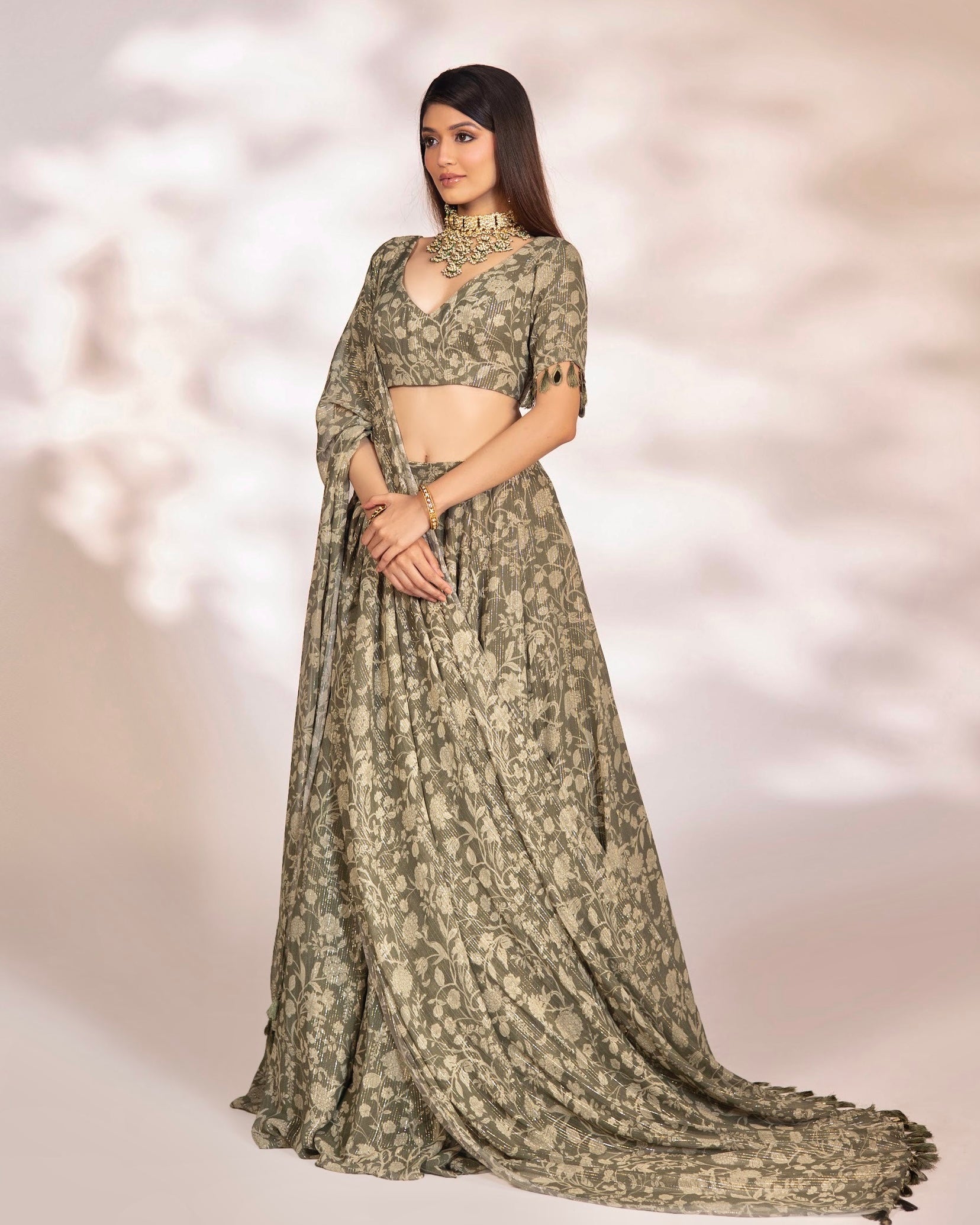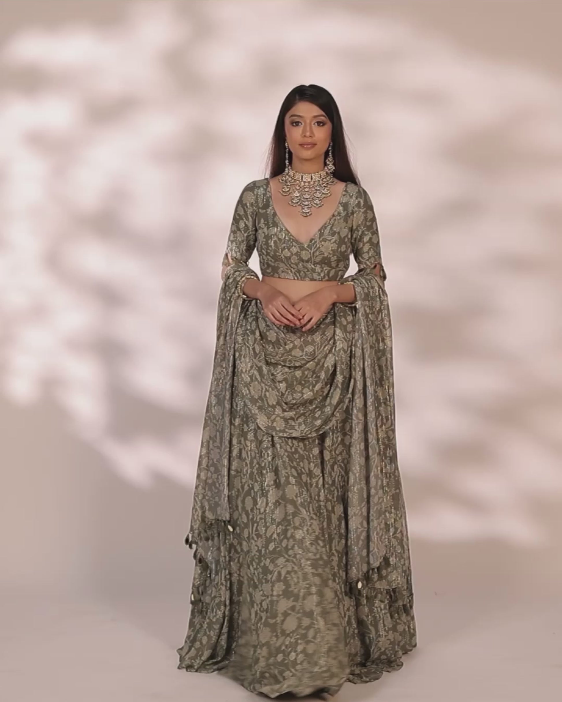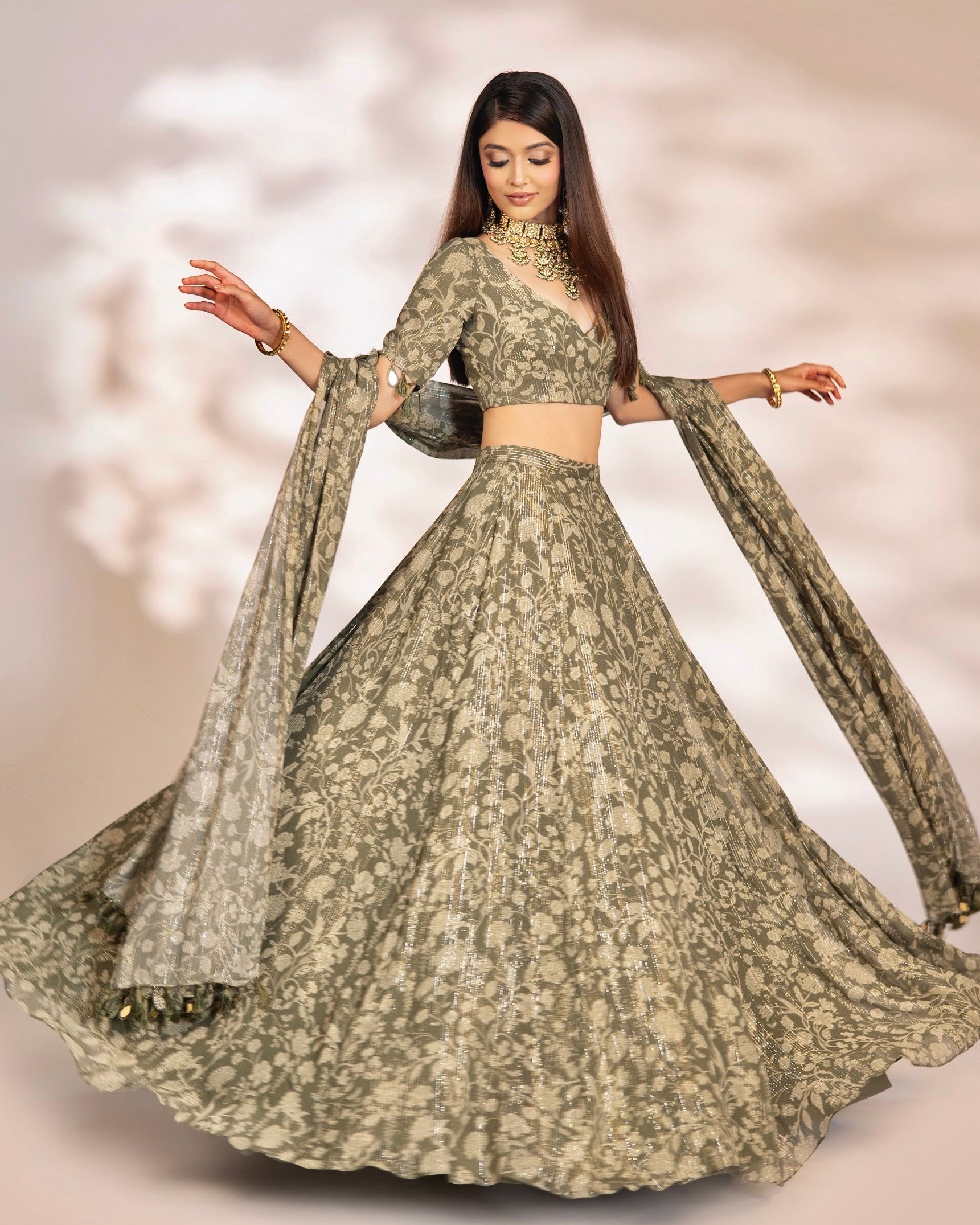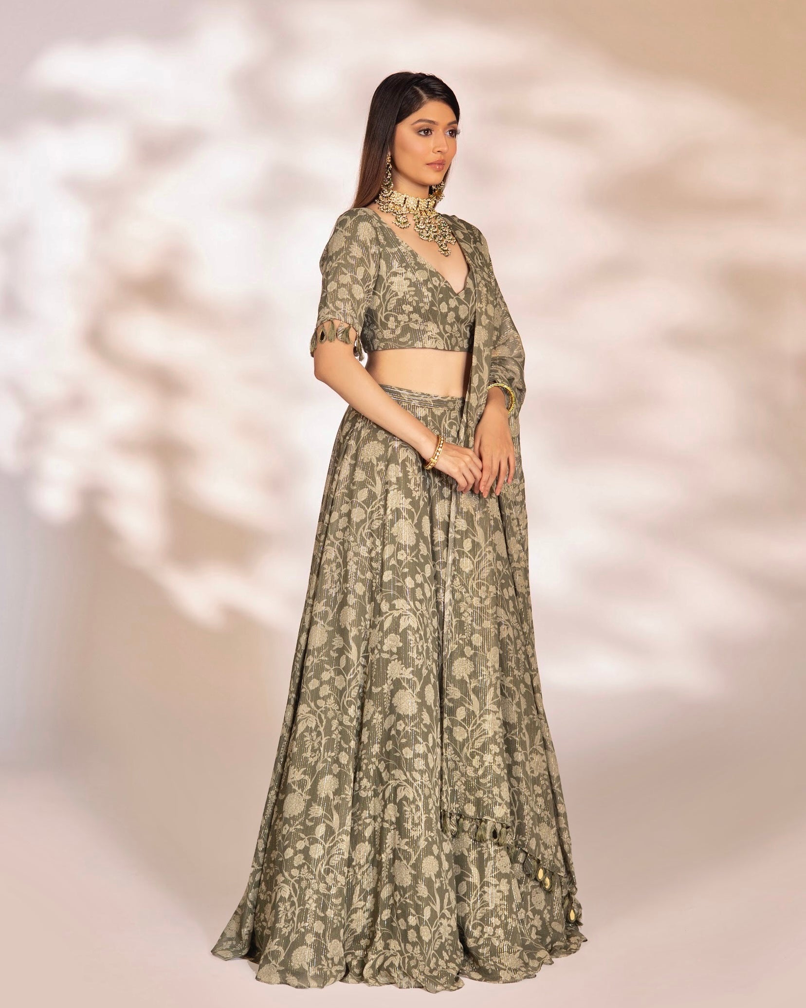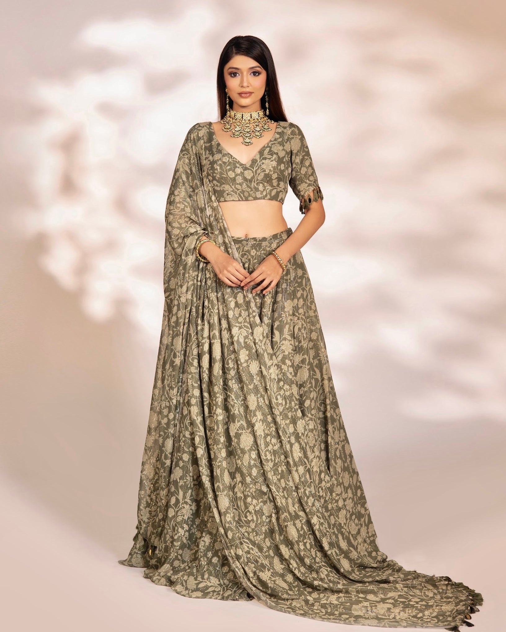 Green lehenga with embroidered tassels on blouse sleeve and dupatta hem.