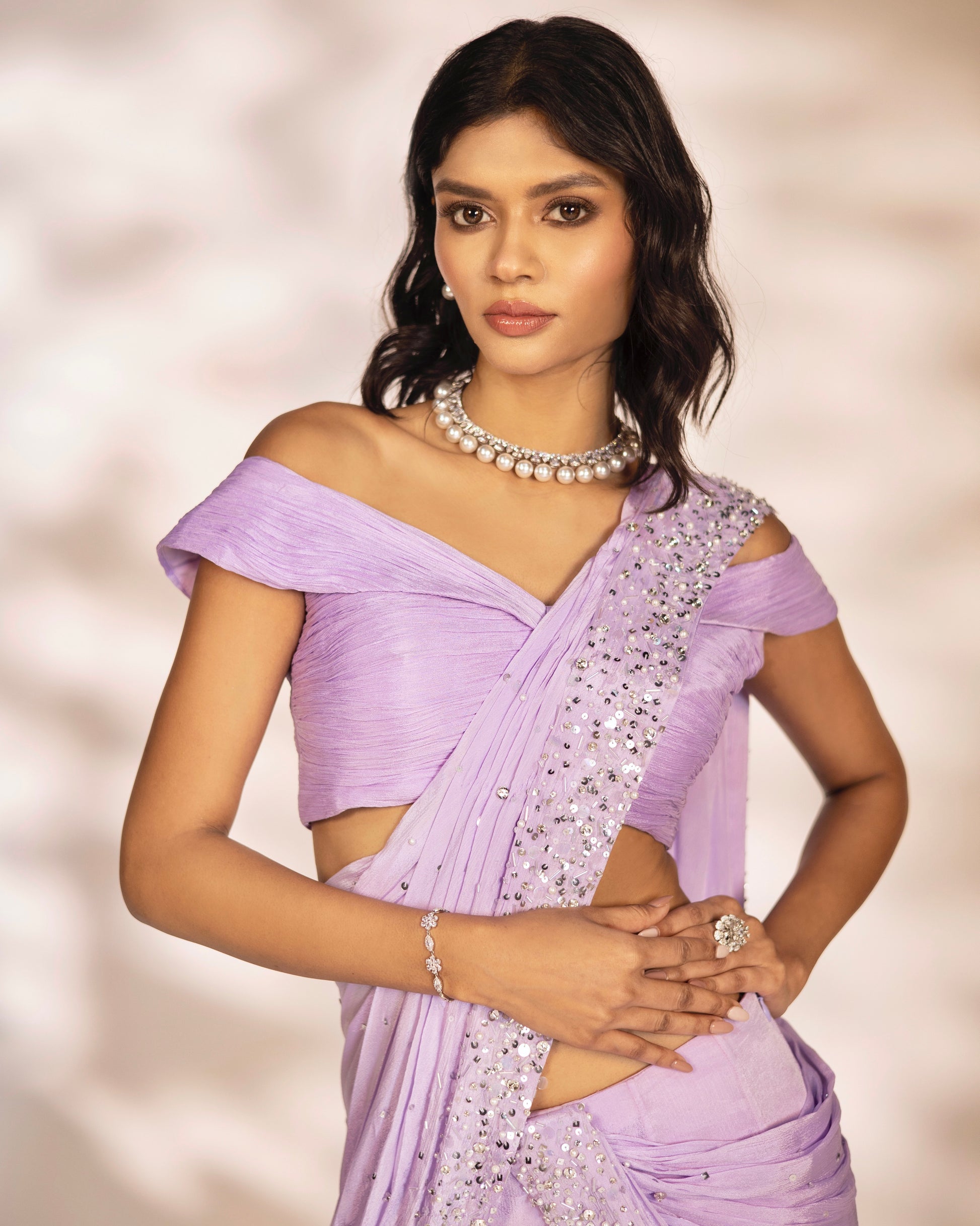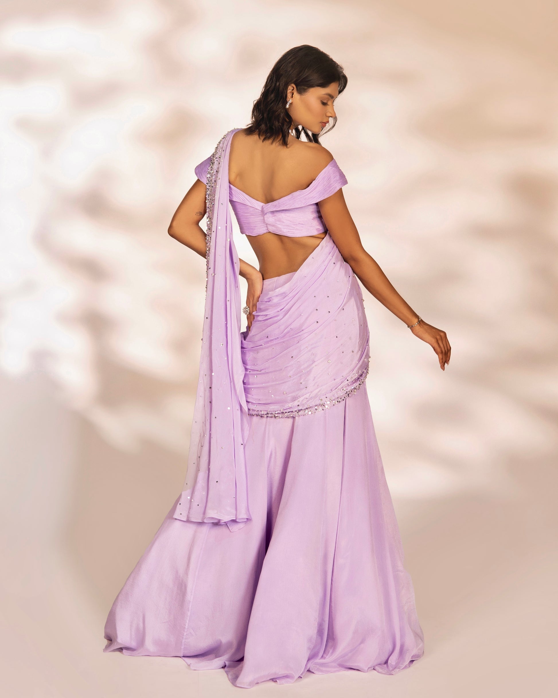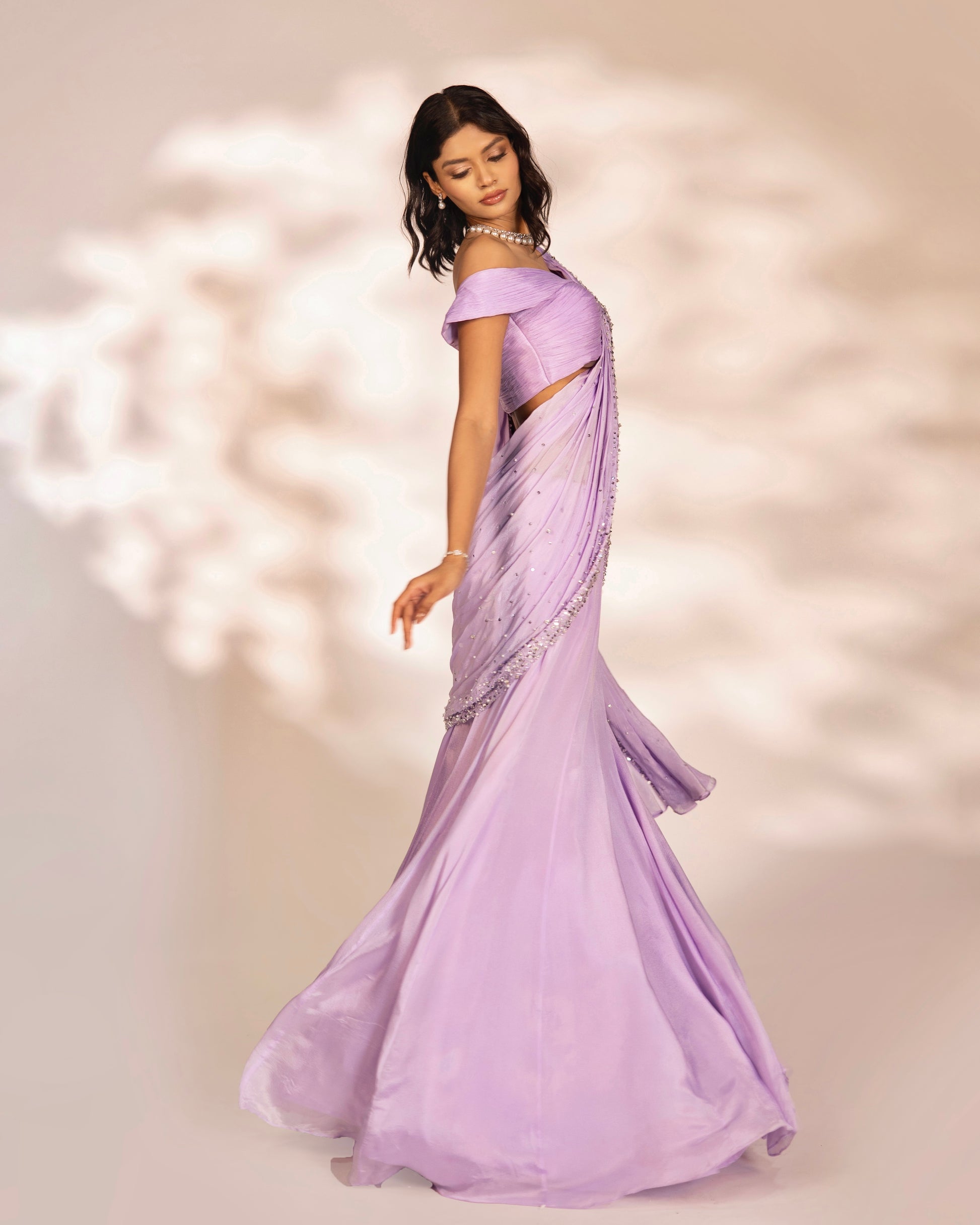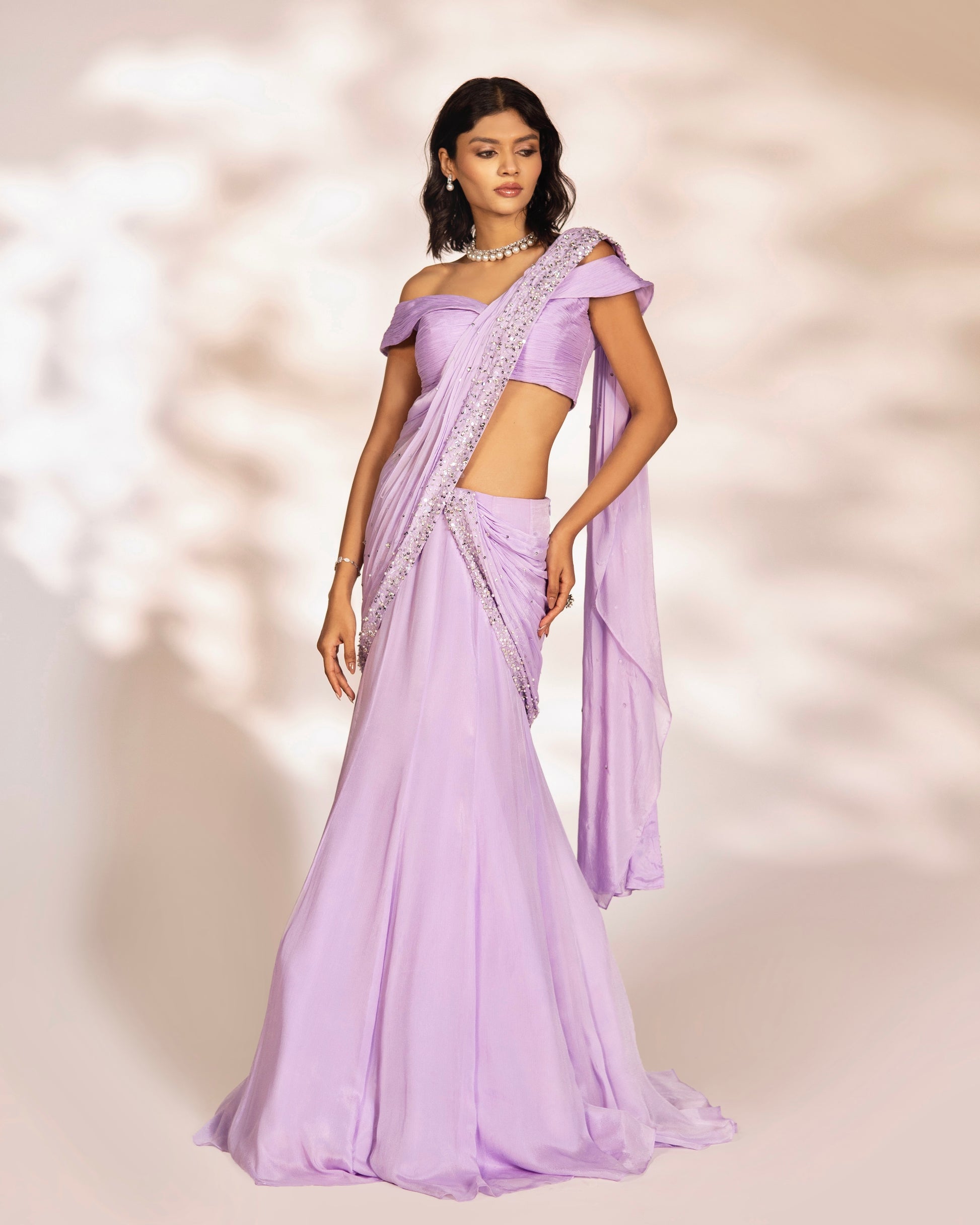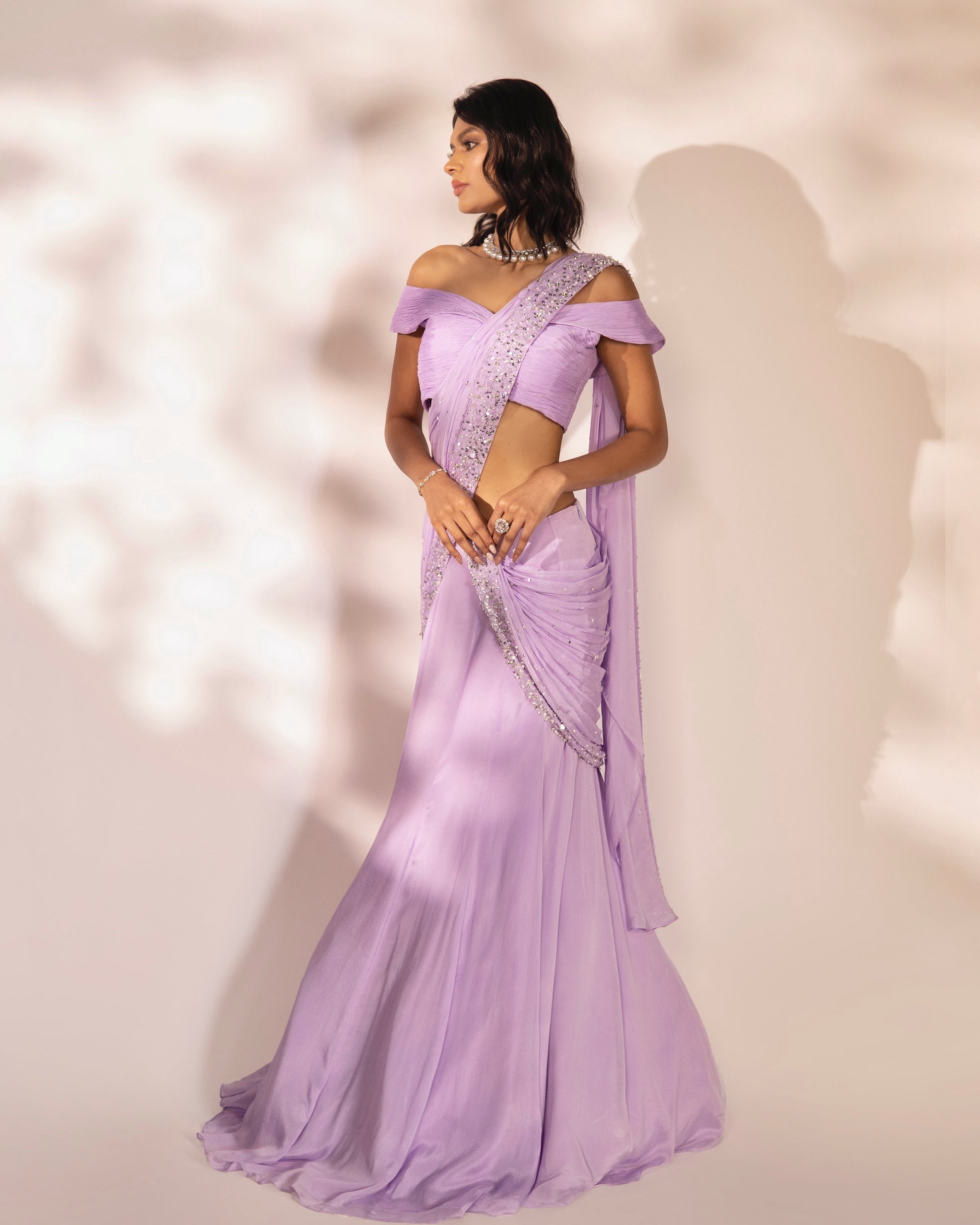 Purple pre-draped saree with an embroidered pallu and ruched off shoulder blouse.