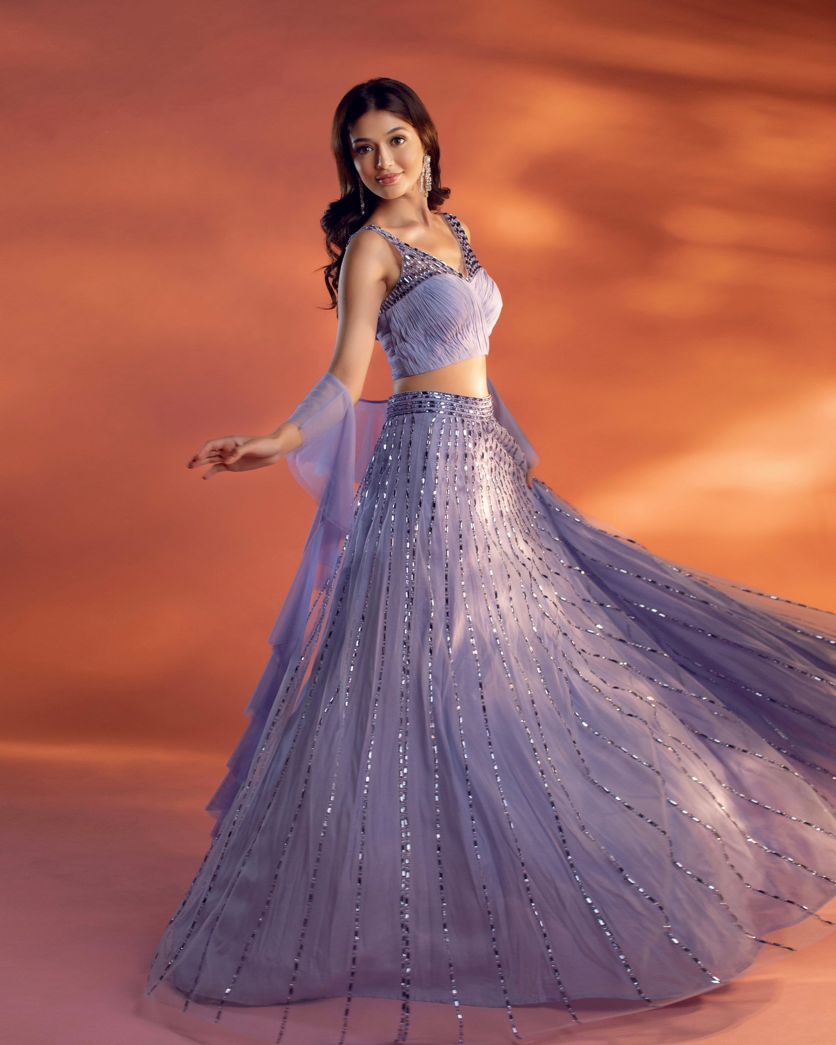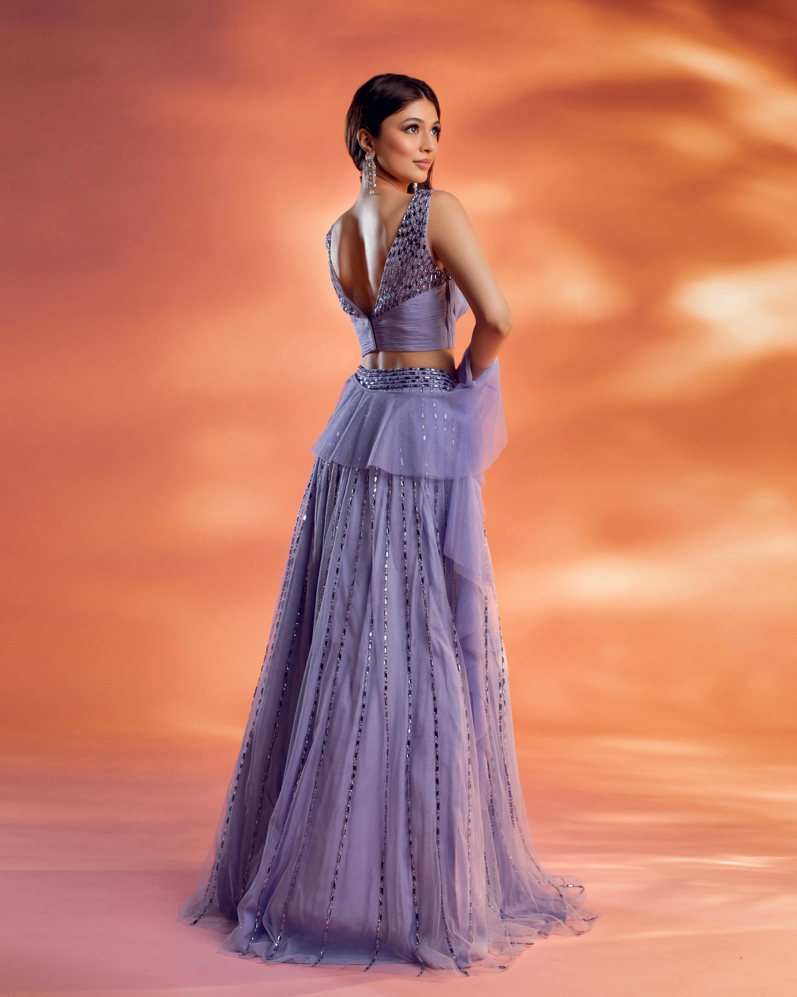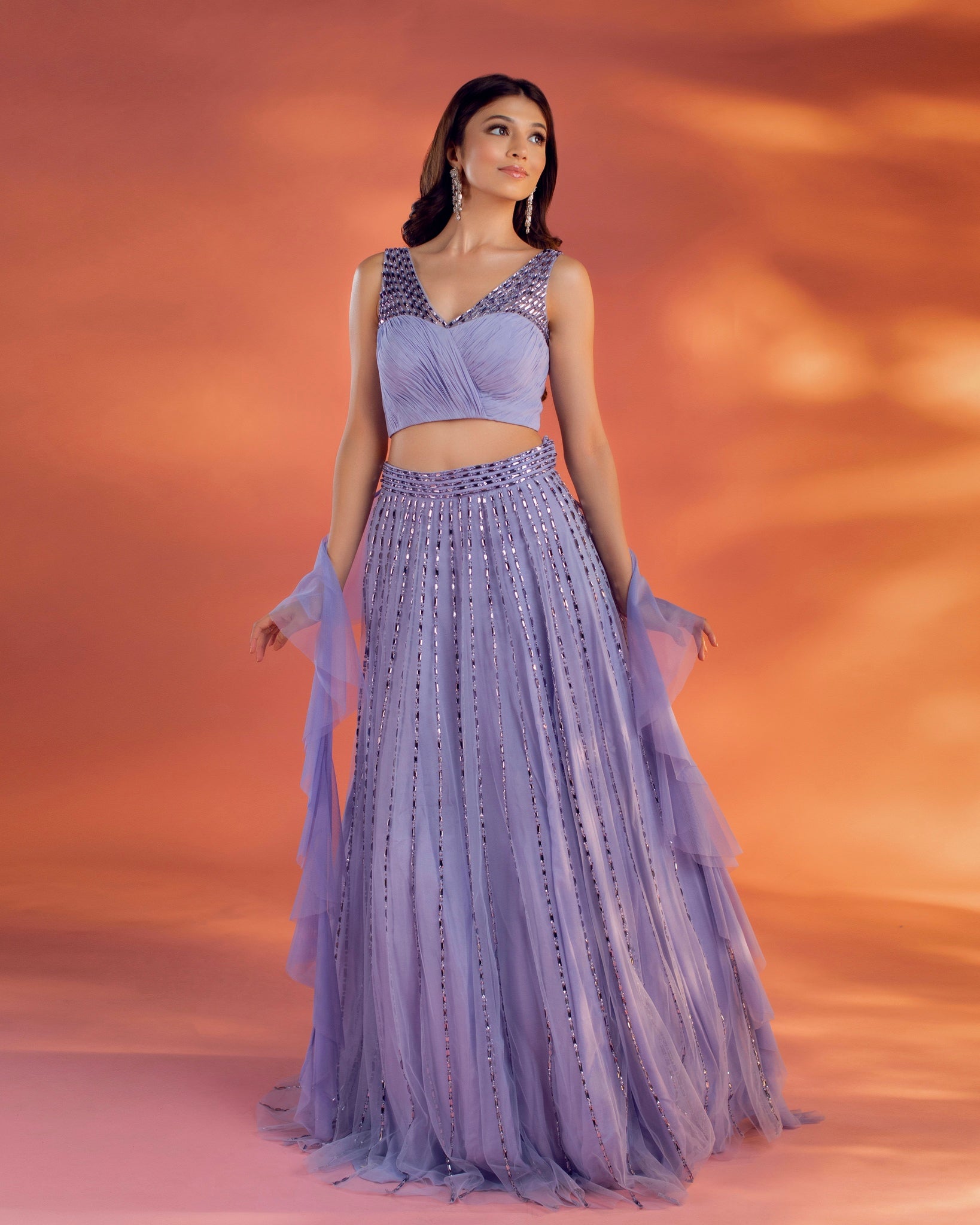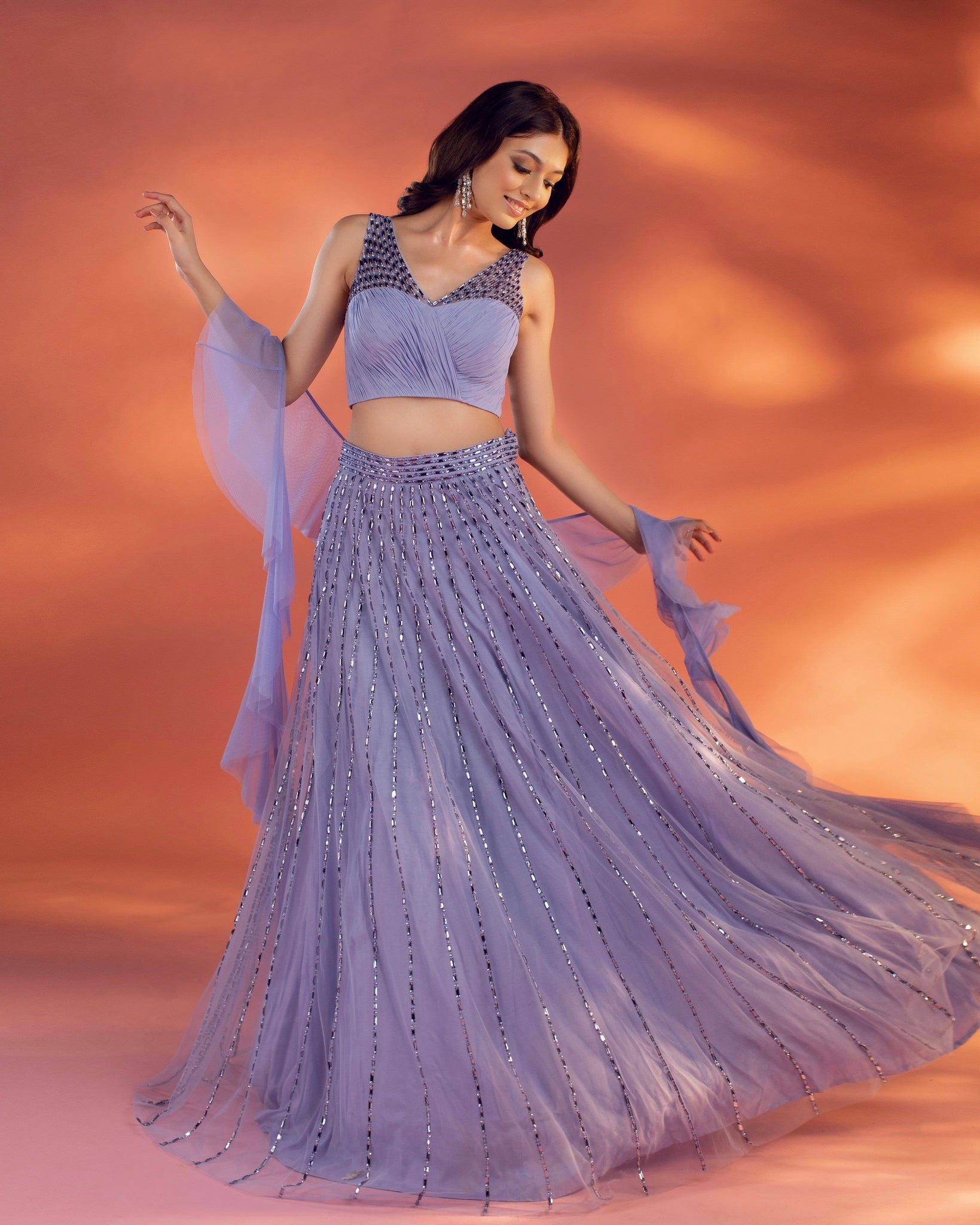 A periwinkle blue net base lehenga embroidered with flat crystal beads, paired with a ruched and embellished blouse along with a ruffled dupatta.