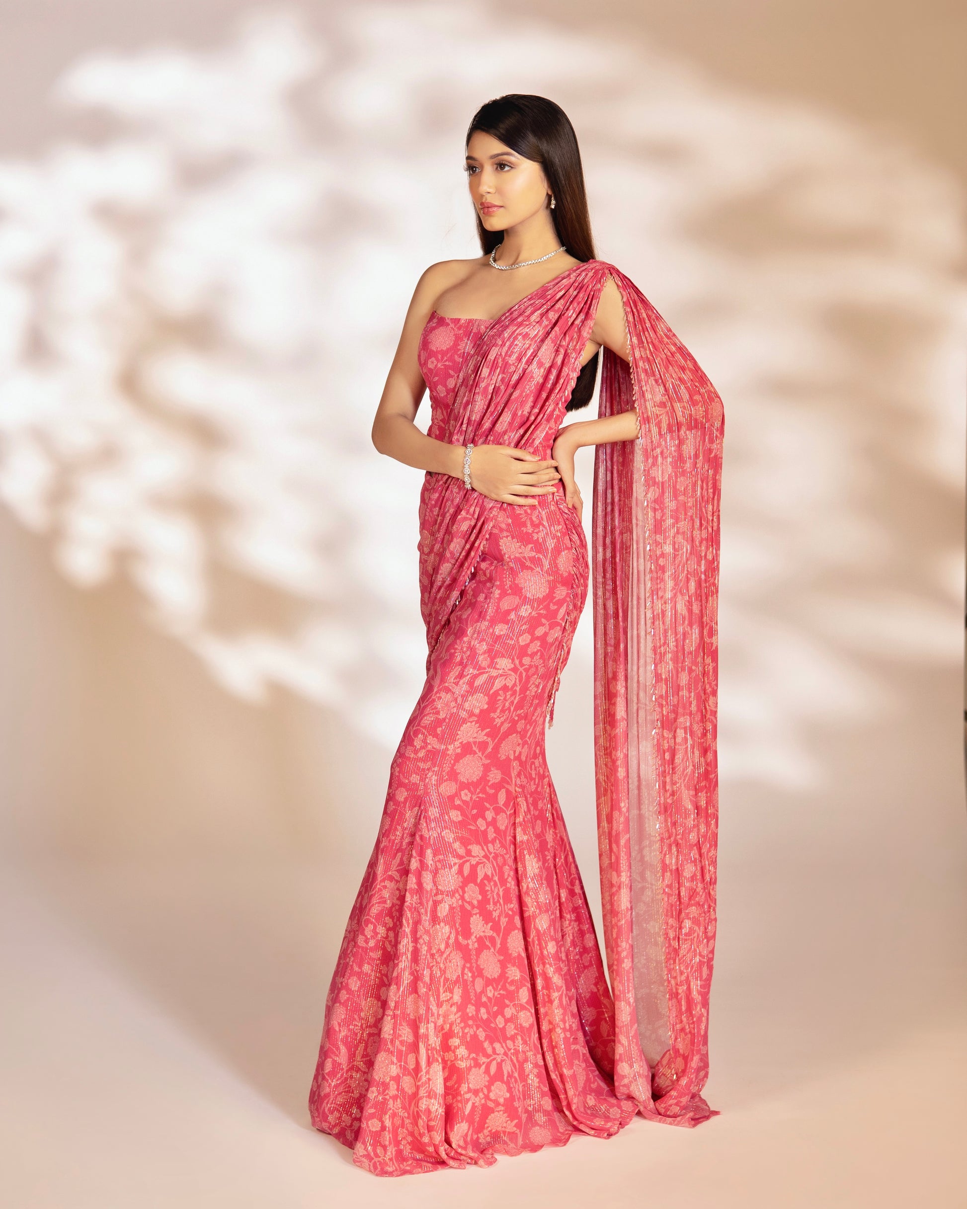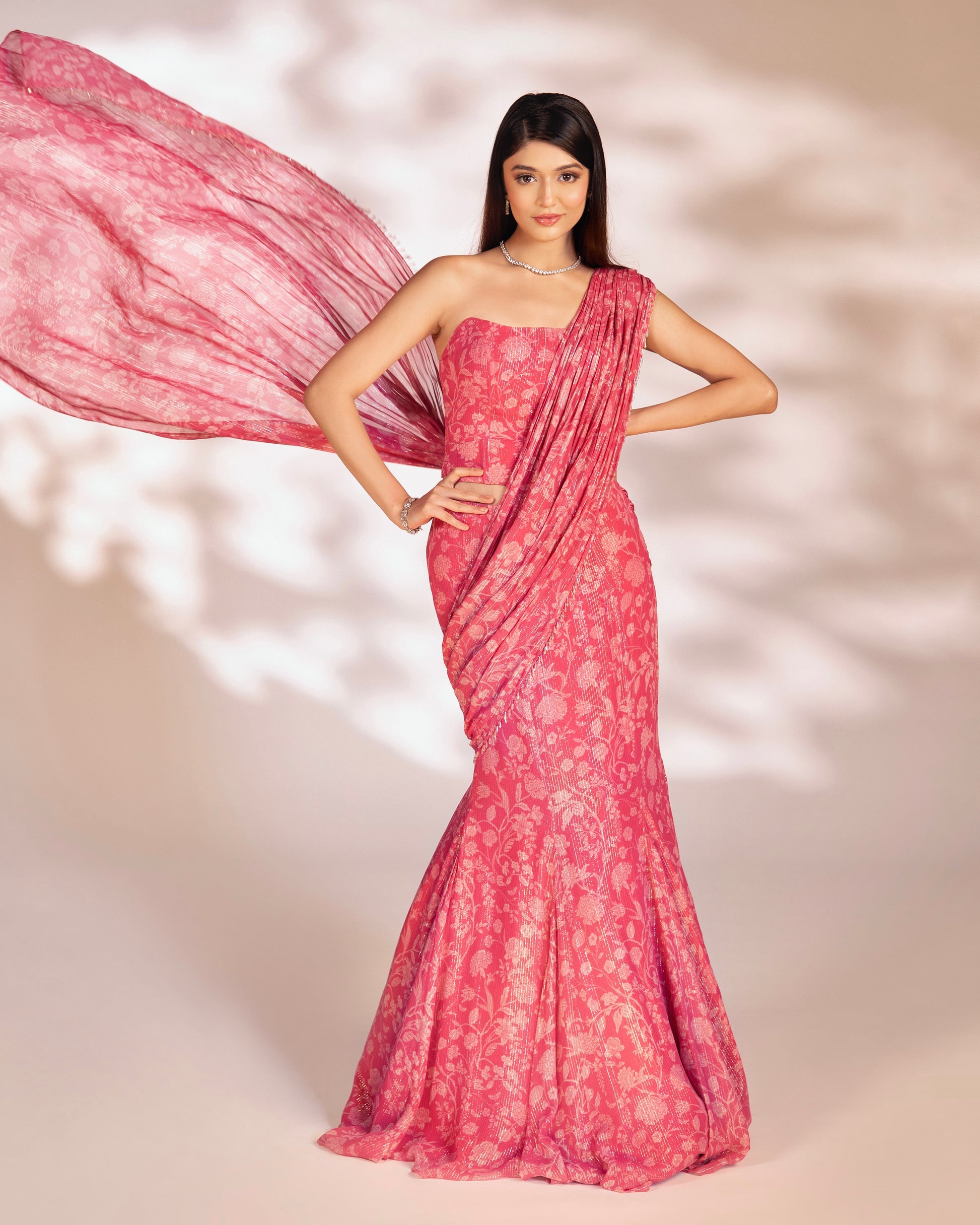 Pink printed pre-draped fishtail saree and corset blouse on a lurex georgette base with an embellished pallu border.