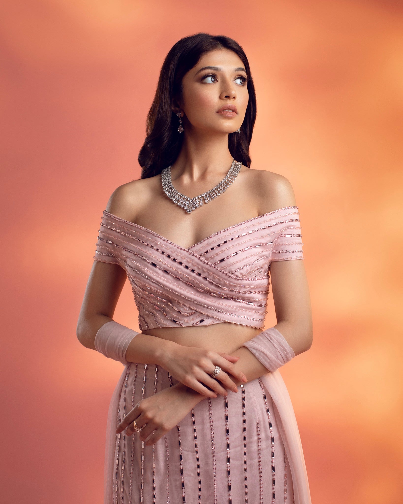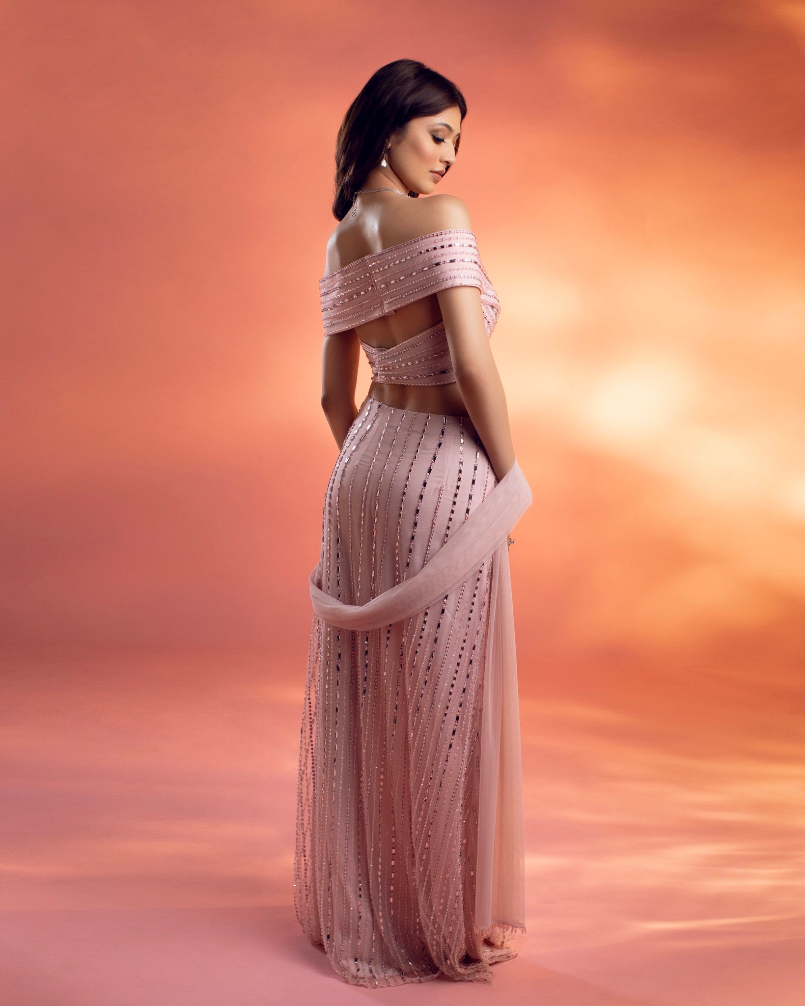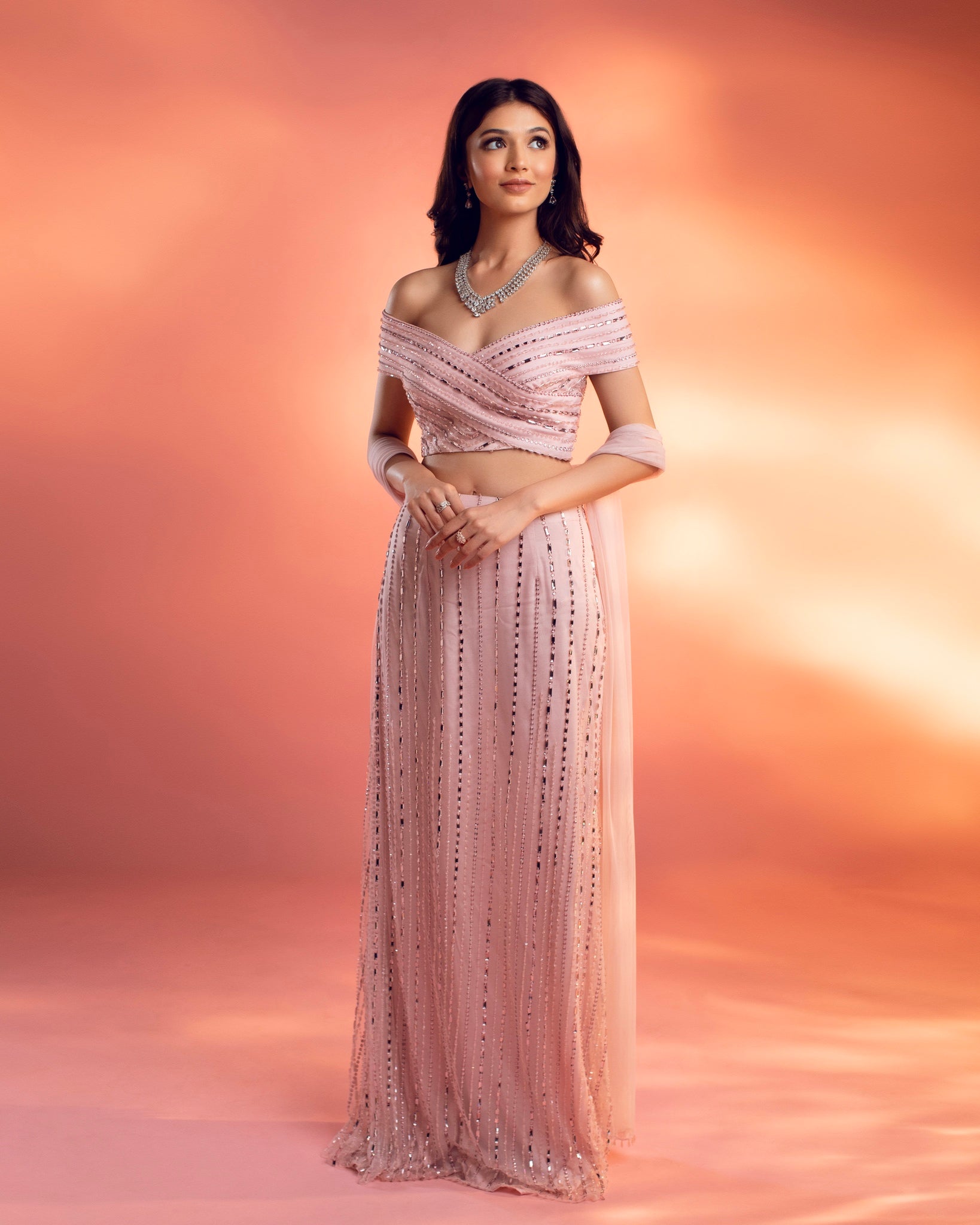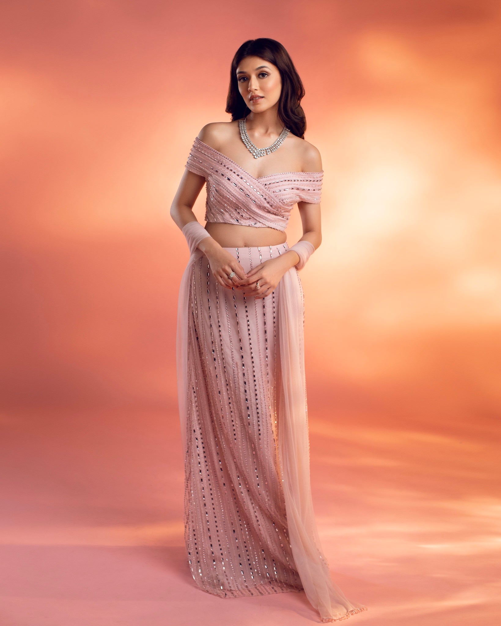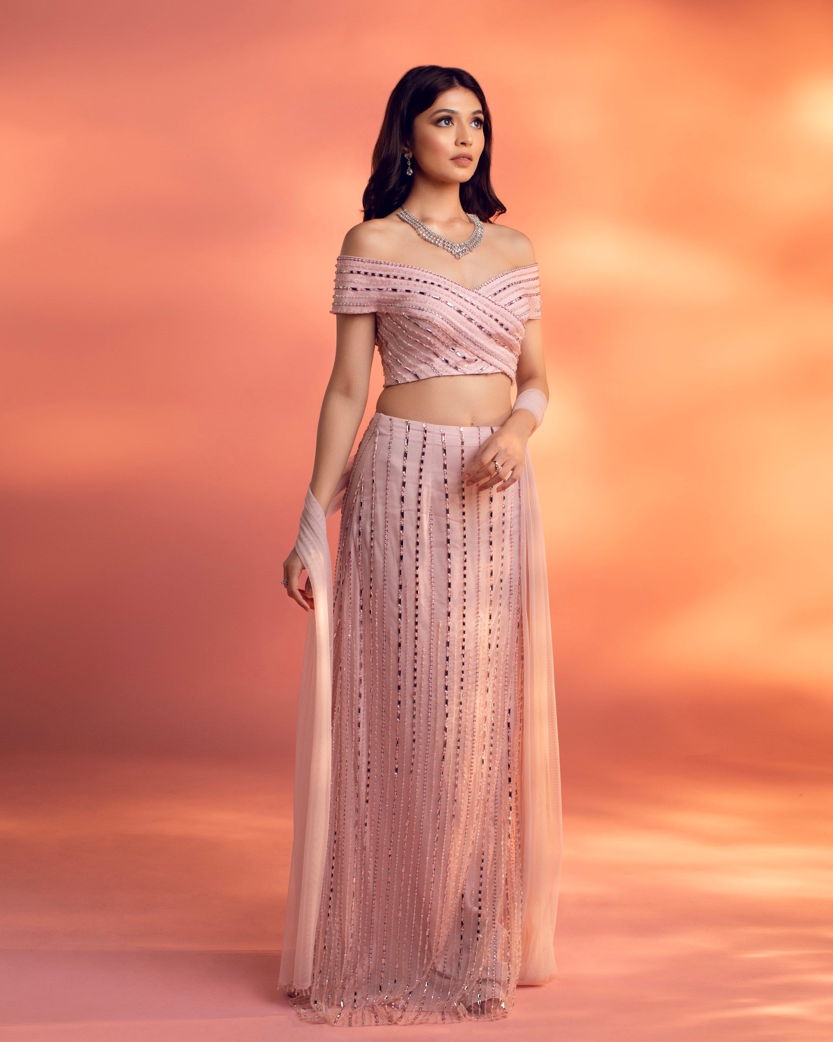 Pink skirt set embellished with flat crystal beads, glass beads, and crystal drops over a net base.