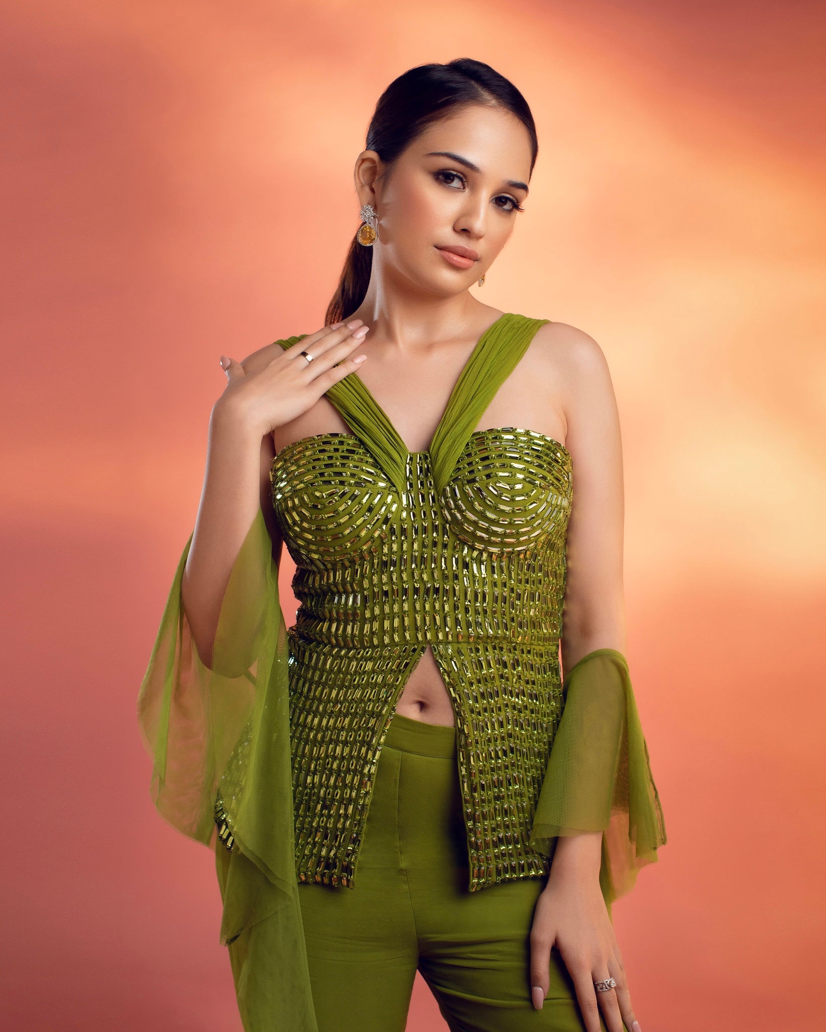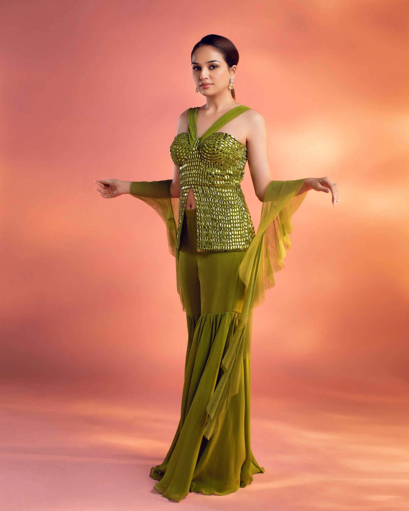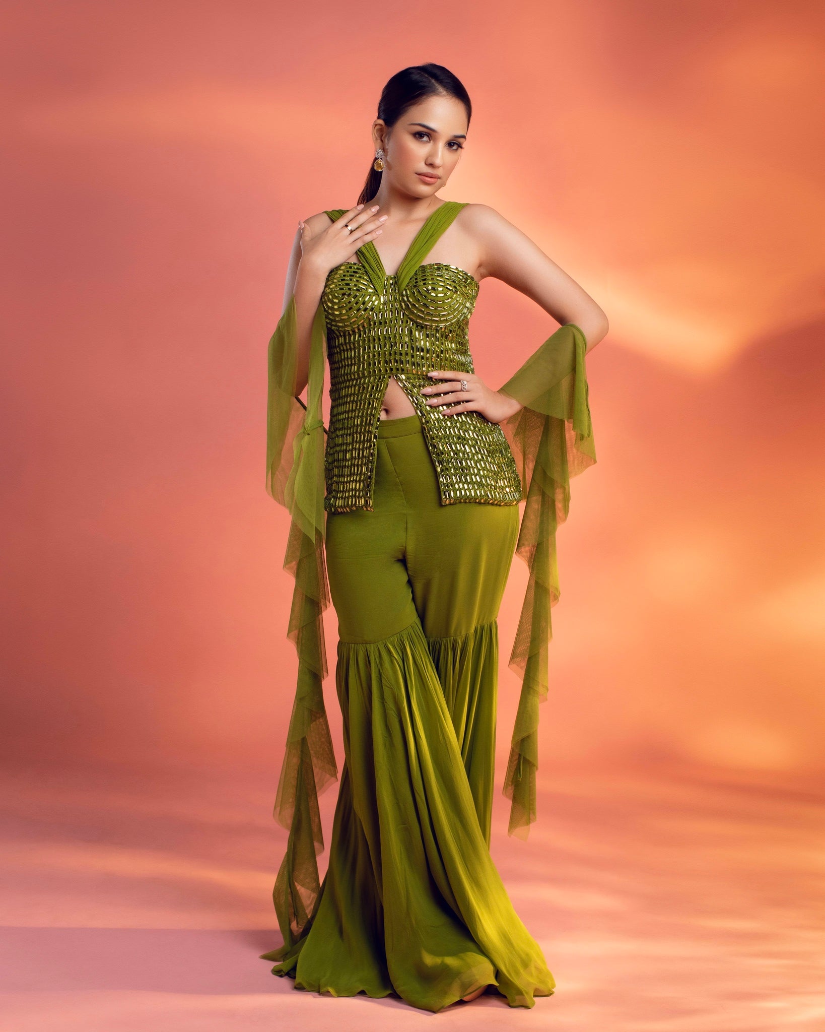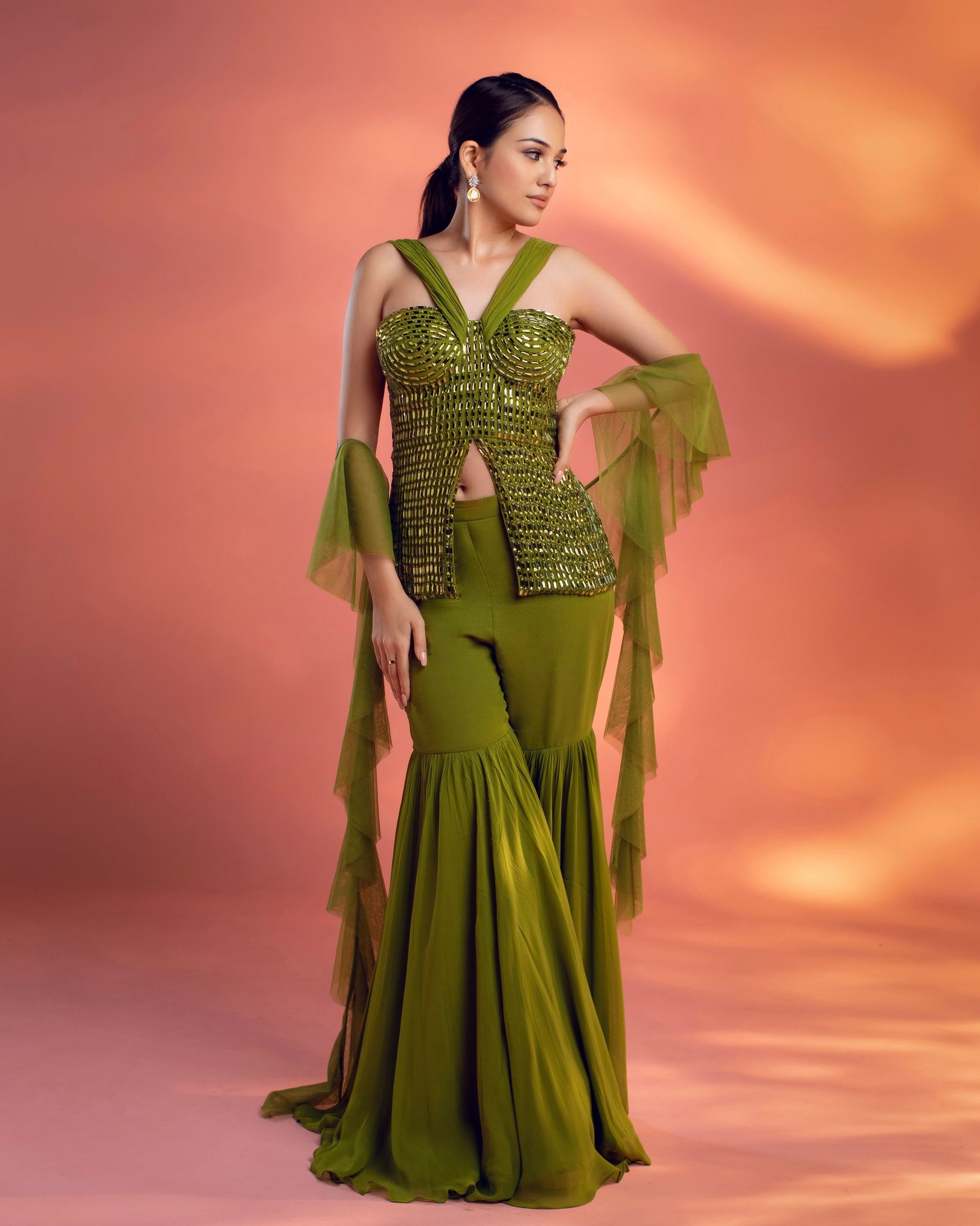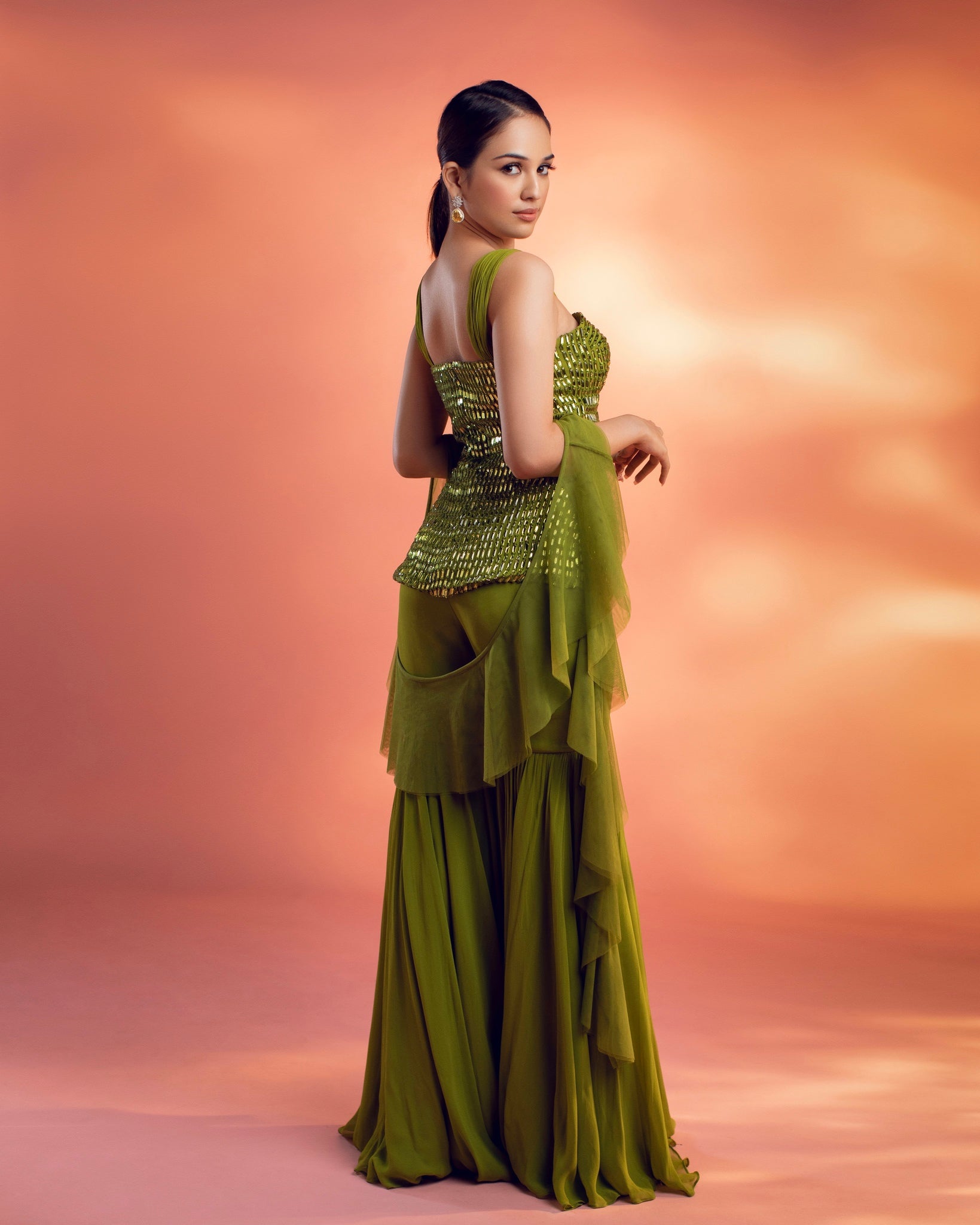 Green sharara set embellished with flat crystal beads over a georgette base paired with a rufffled dupatta.